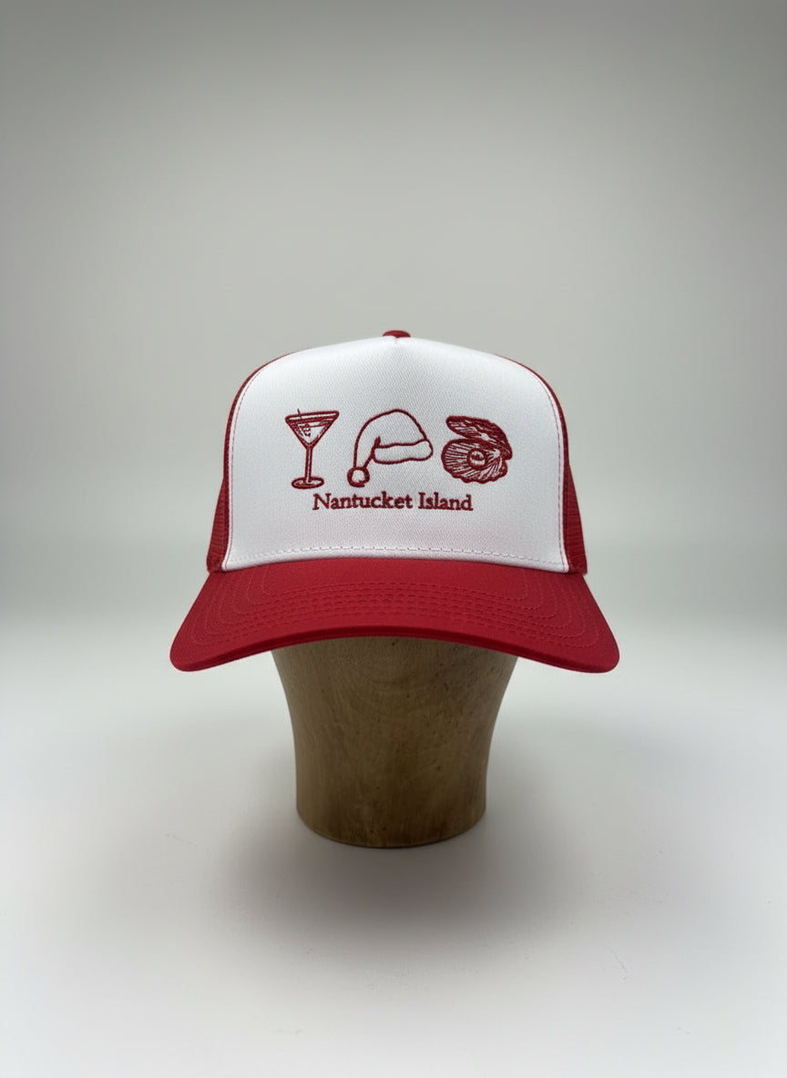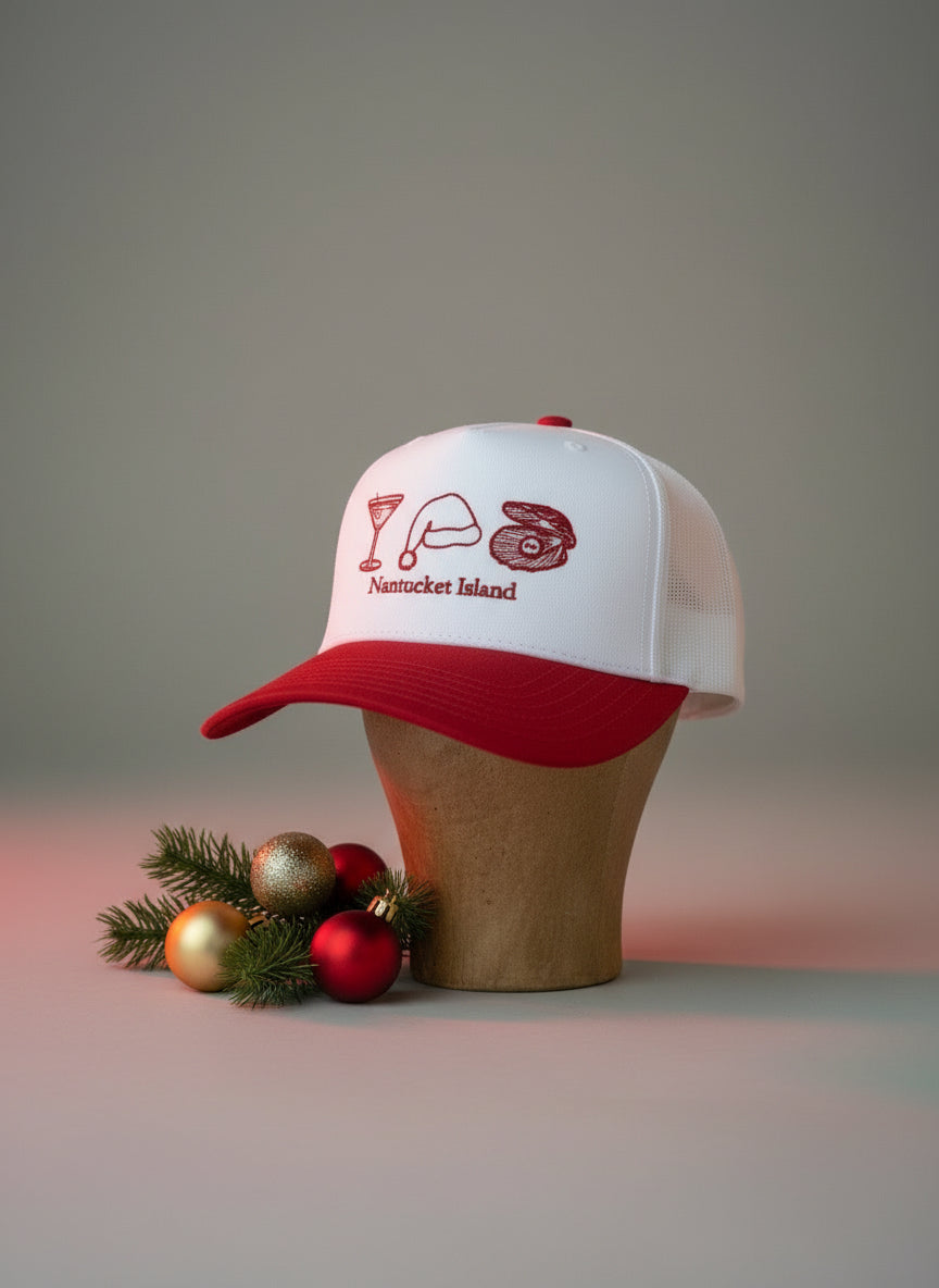 A festive twist on the cult-loved coastal aesthetic, this custom trucker hat channels the playful spirit of the iconic “30 miles out” look with a For Now holiday spin. Featuring a trio of embroidered Nantucket icons—a martini glass, Santa hat, and oyster—this design captures the island’s Stroll-season personality: equal parts merry, cheeky, and unmistakably Nantucket.