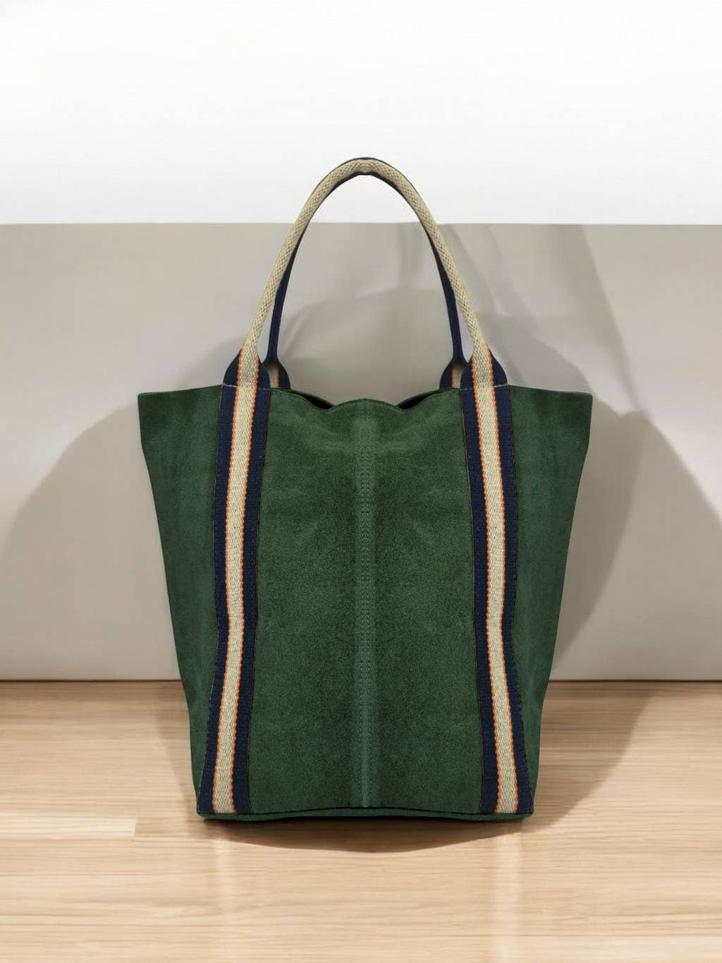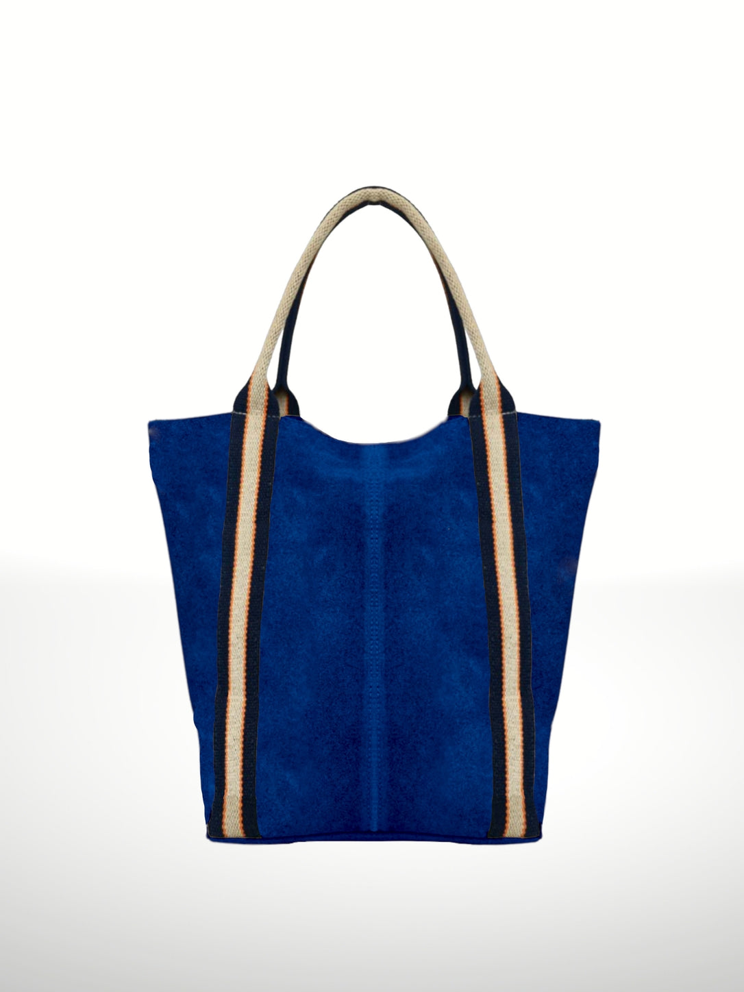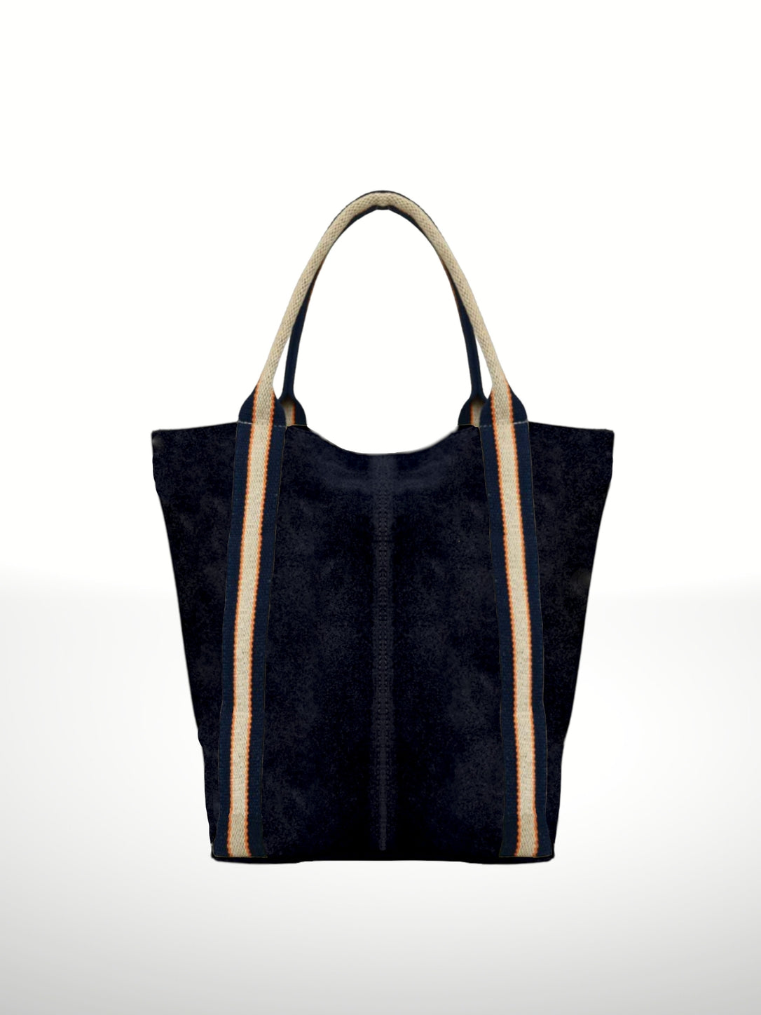 This genuine suede cowhide tote bag combines practical design and sophistication in one piece. Its flexible and spacious structure makes it ideal for everyday use, while its tricolor cotton handles add a distinctive and modern touch.