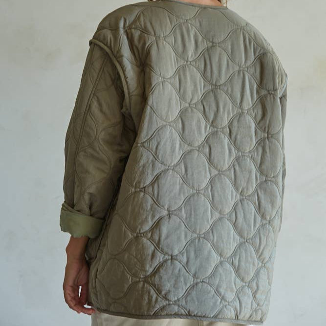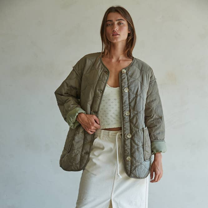 A For Ever layering piece with utility baked in. This quilted nylon jacket is lightweight but warm, cut with a relaxed fit and a clean V-neckline that makes it easy to wear over just about anything.