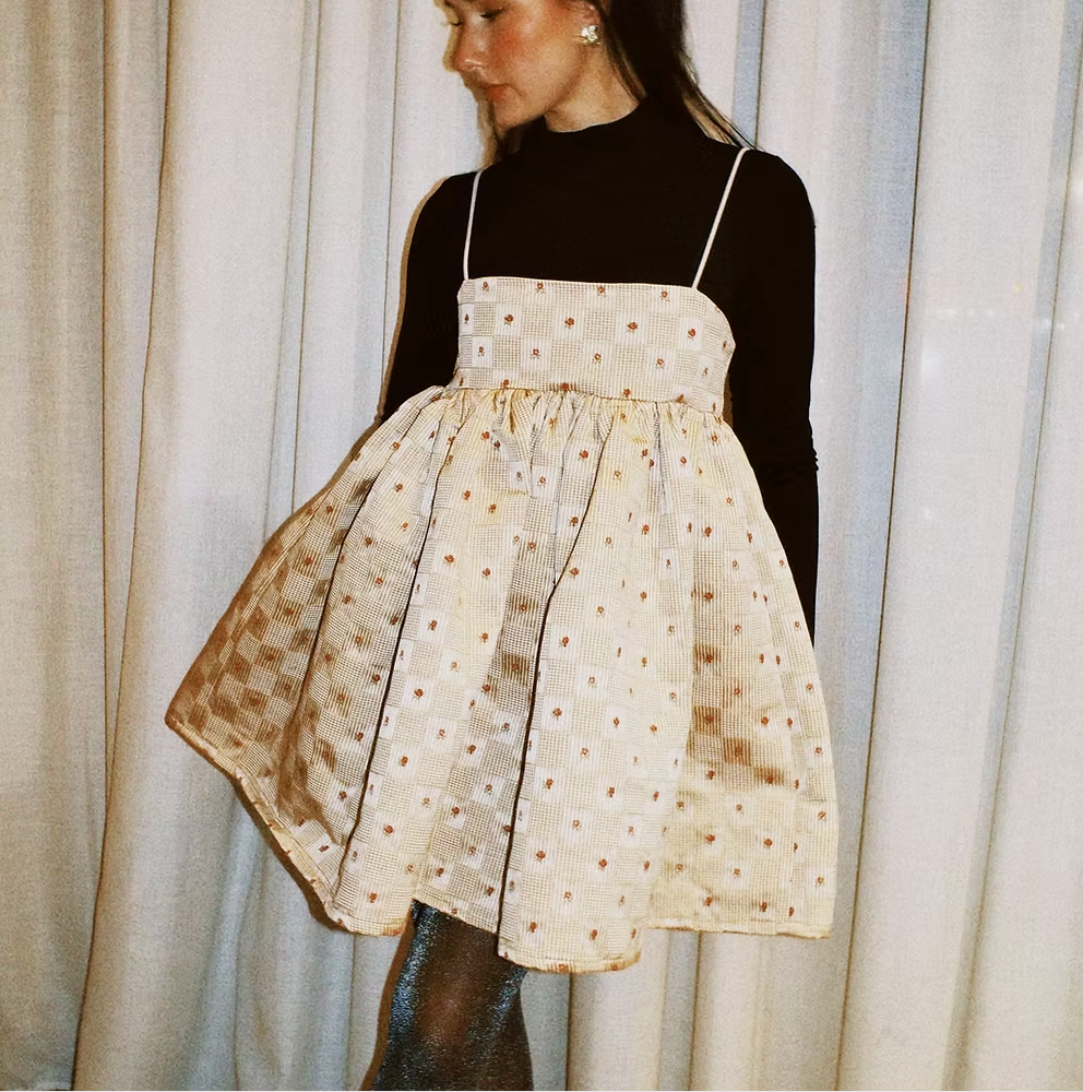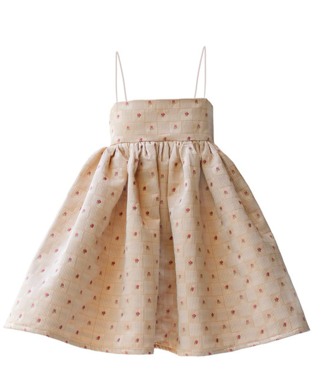 The Metallic Rose Puff dress is a popover babydoll style mini dress that showcases a straight-across neckline, neutral corded straps, and a voluminous skirt. Made from a medium weight  metallic fabric, it features embroidered small red flower motifs scattered across checkered ribbed gold stripes giving the illusion of a luxurious picnic plaid.