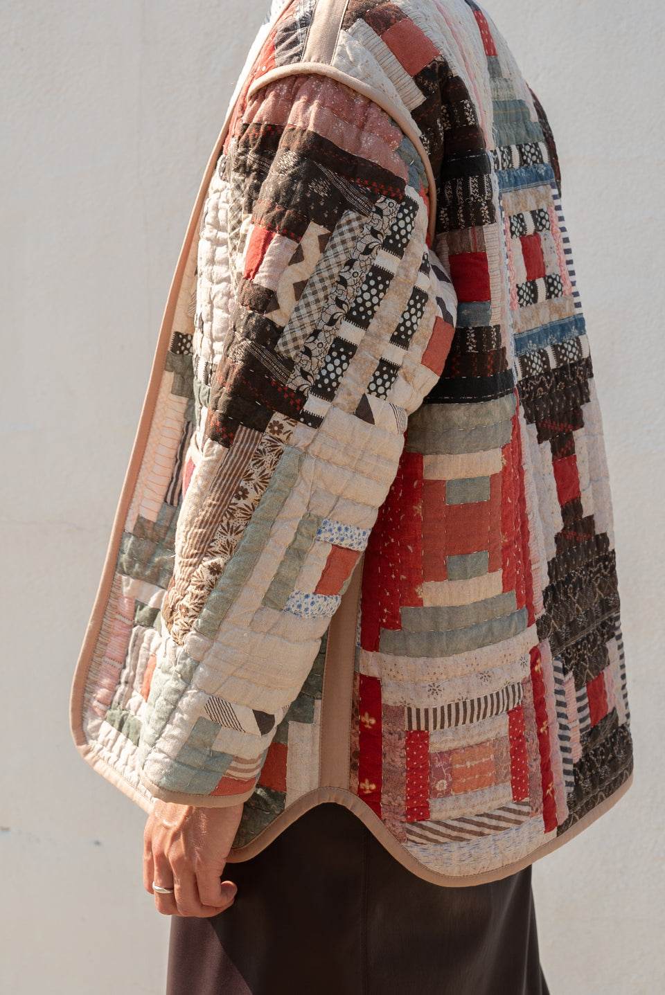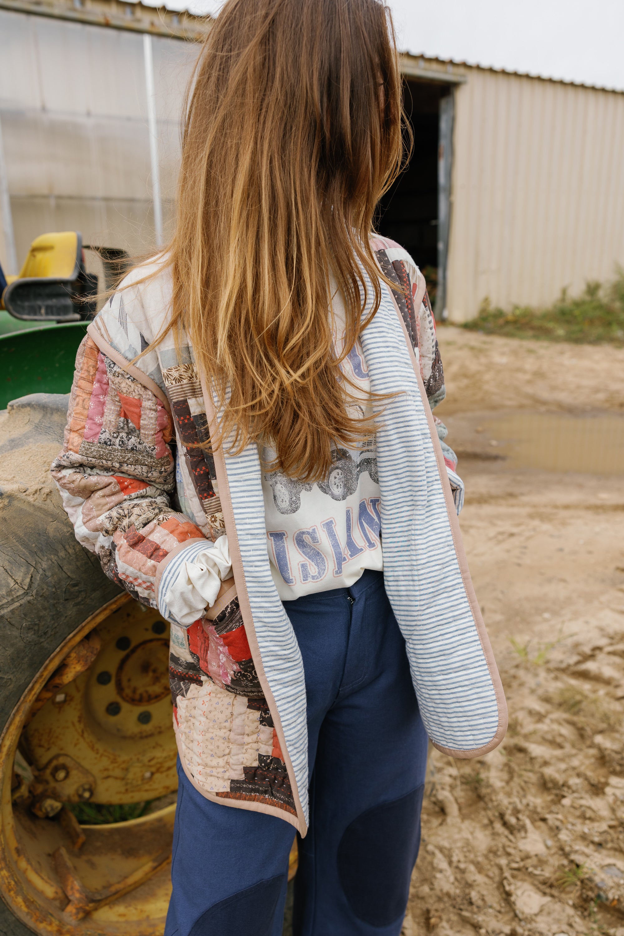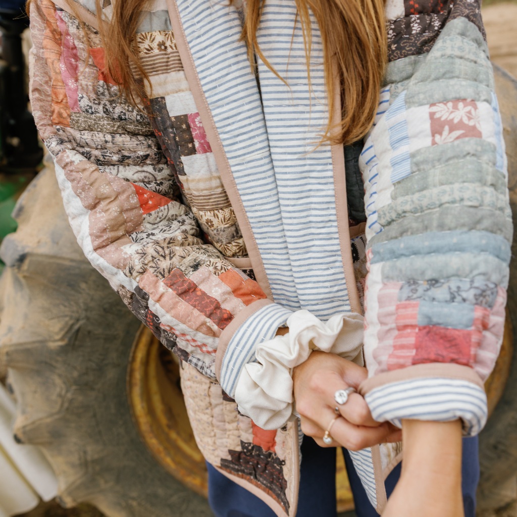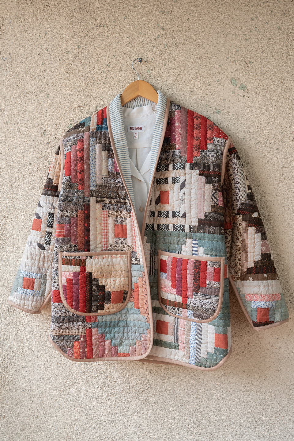 This hand-stitched coat is wearable art For cool fall days and cozy winters. It's meticulously crafted with vintage cotton binding and lined with a cotton blue pinstripe. You'll be delighted by the details every time you slip it on.