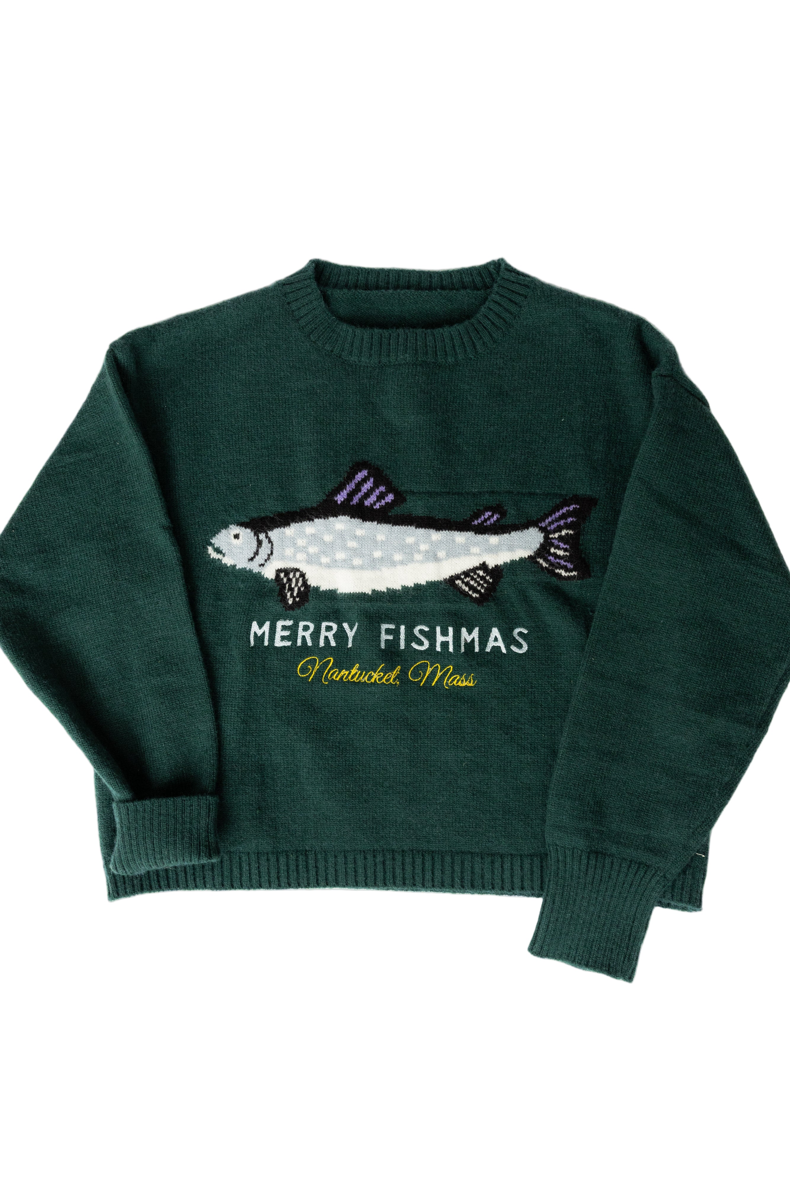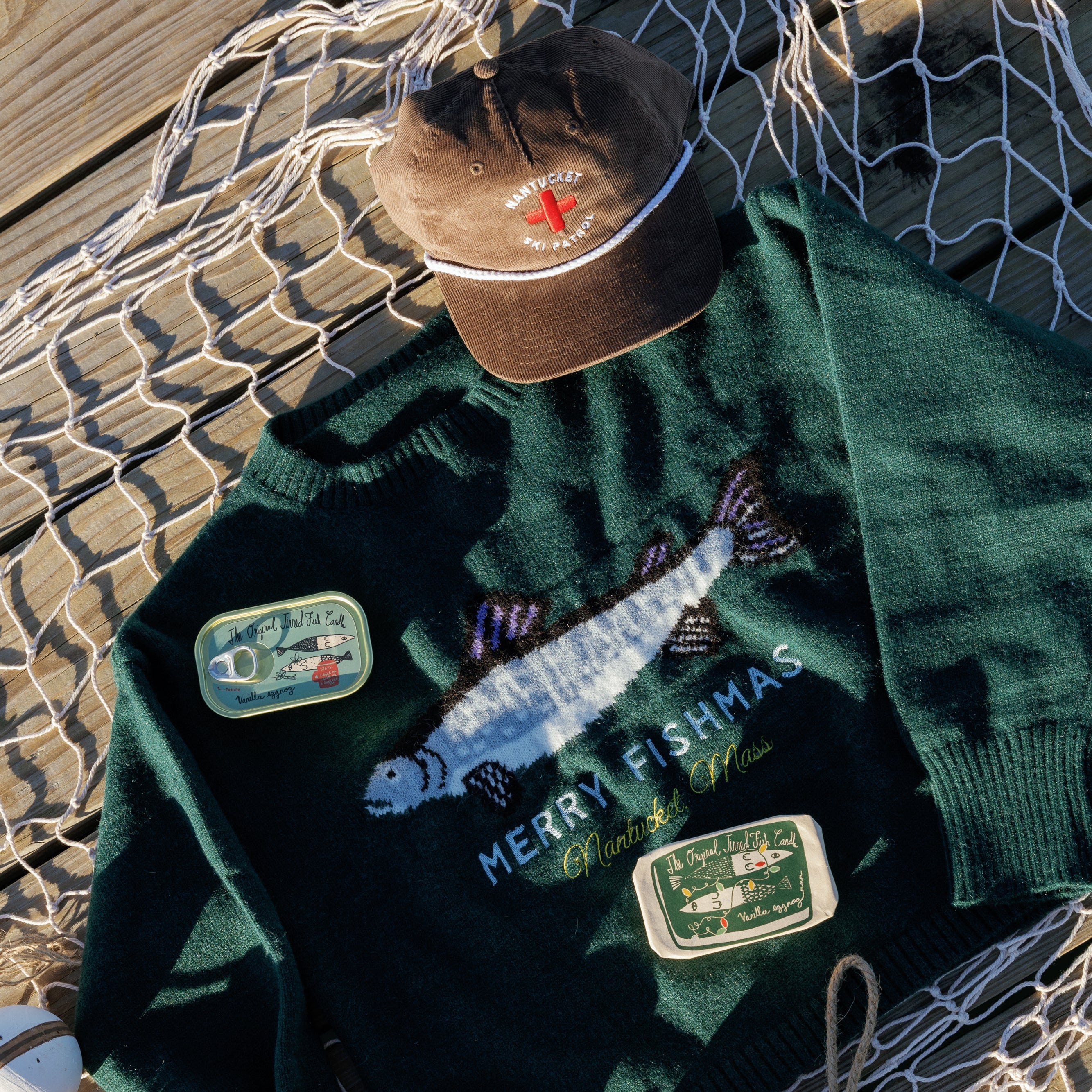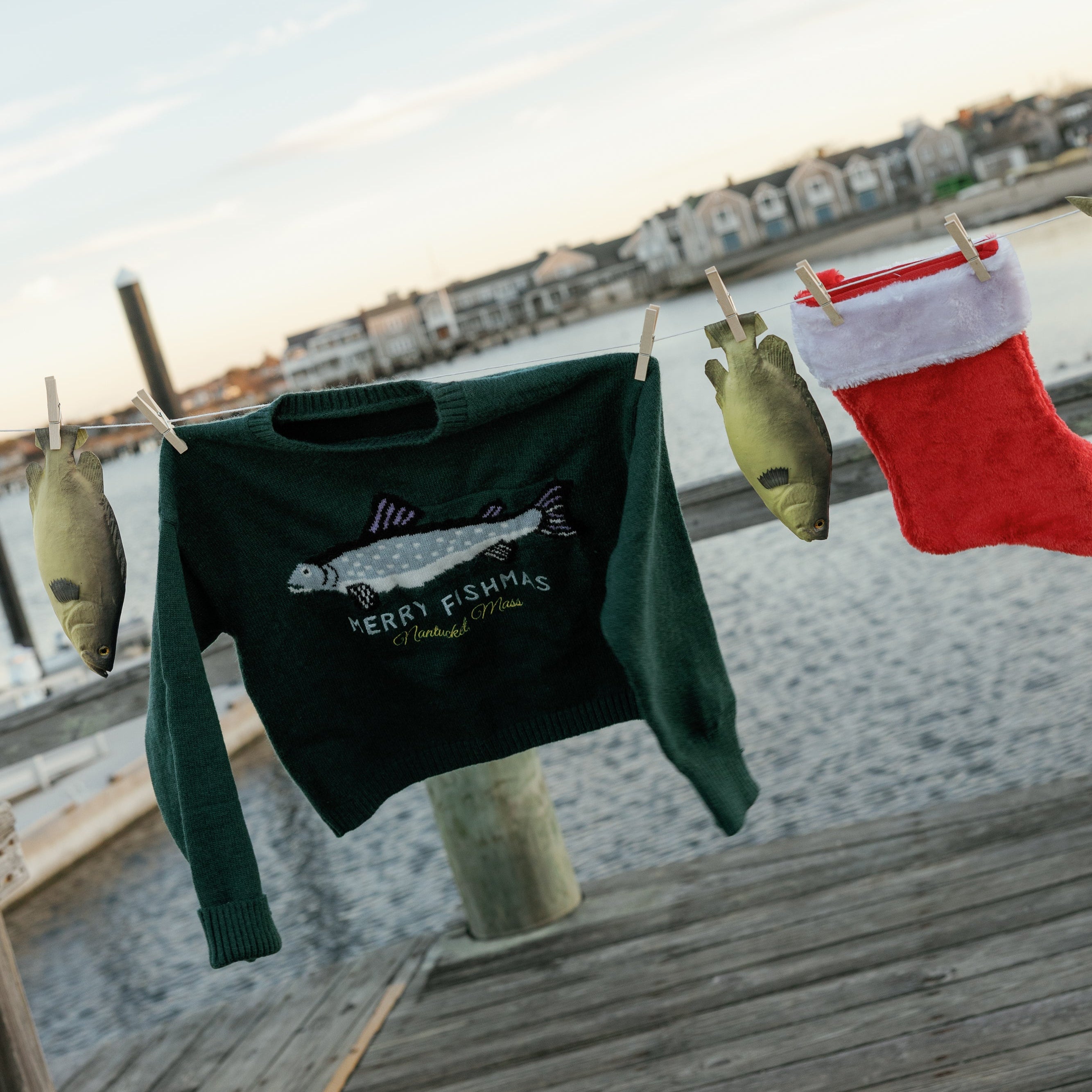 A very Merry Fishmas from Nantucket! Celebrate the season with the Fishmas Sweater, embroidered right on island. Featured in a stunning hunter green, this playful sweater is the perfect cozy Nantucket holiday keepsake For the island girl who has everything.