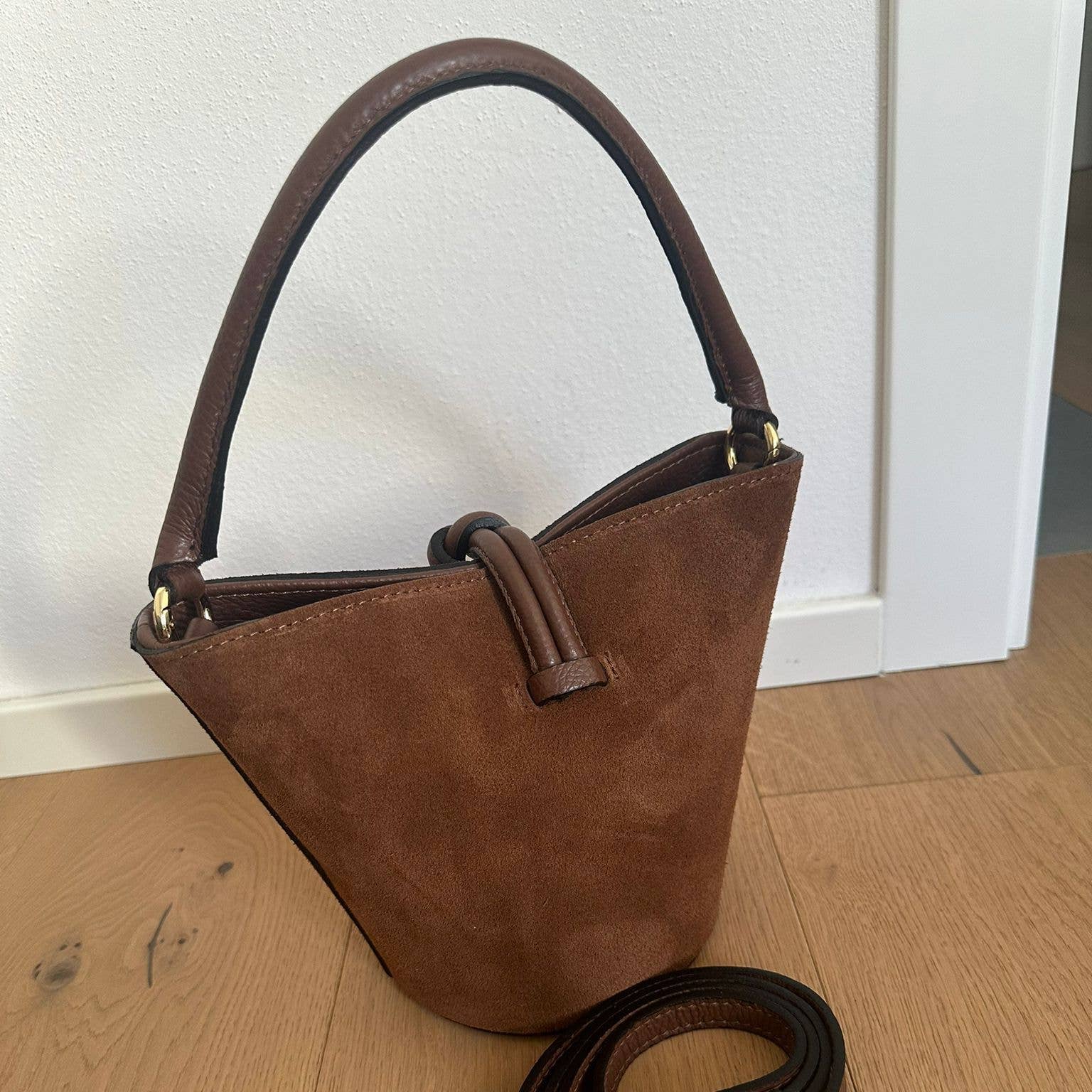 Equal parts chic and practical. Handcrafted in Italy from genuine leather and suede, this bucket bag easily shifts from polished dinners to casual crossbody days.