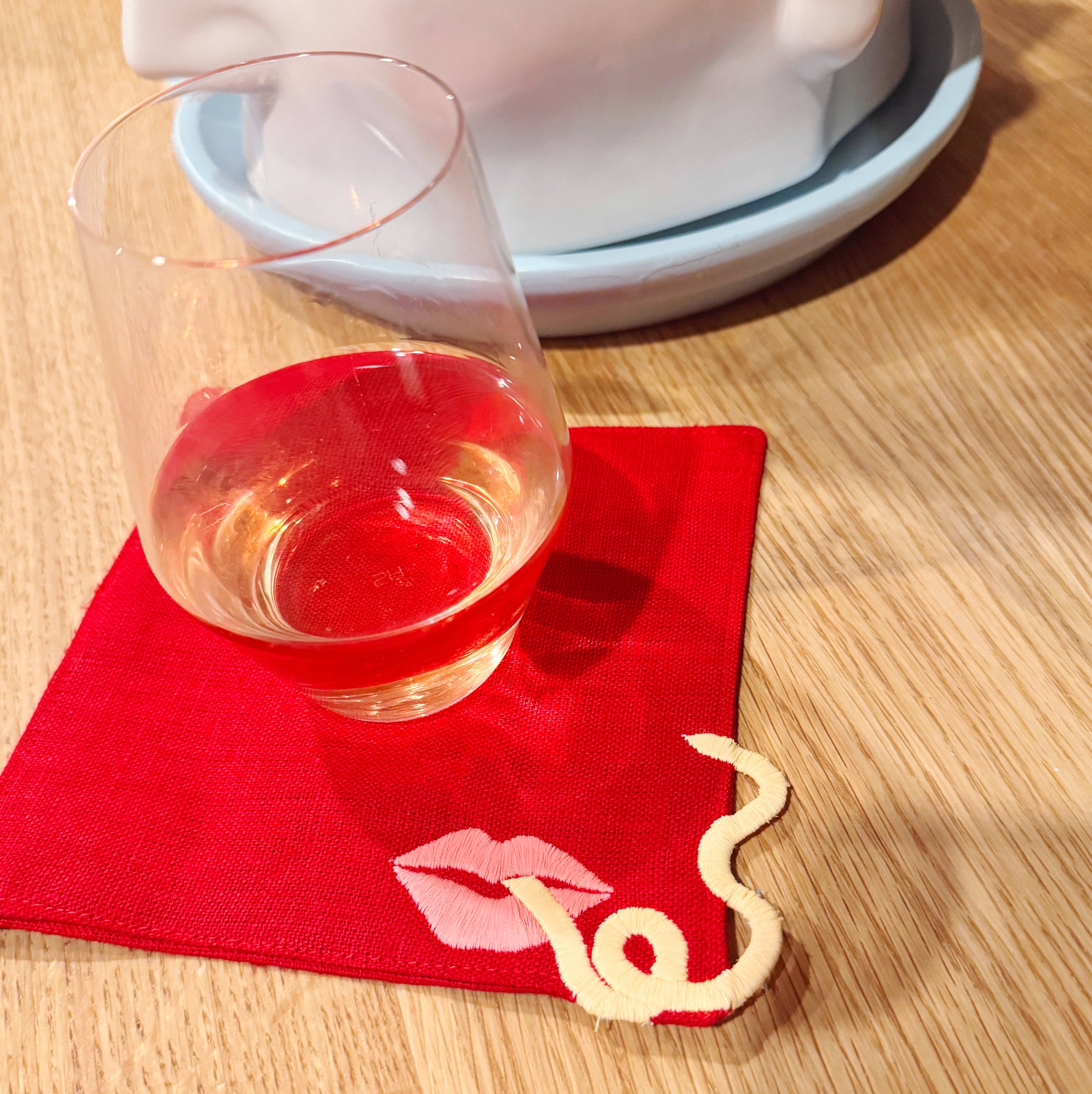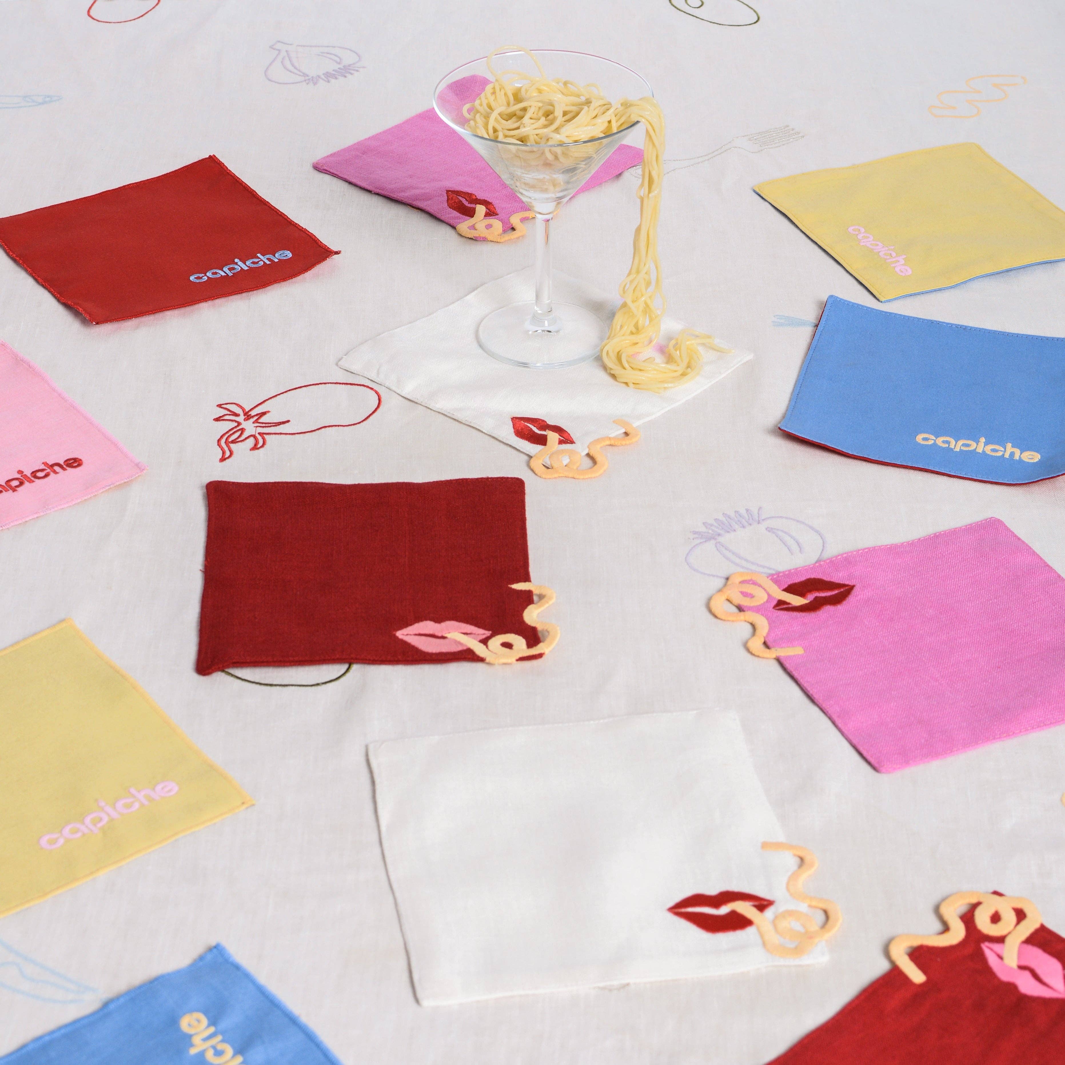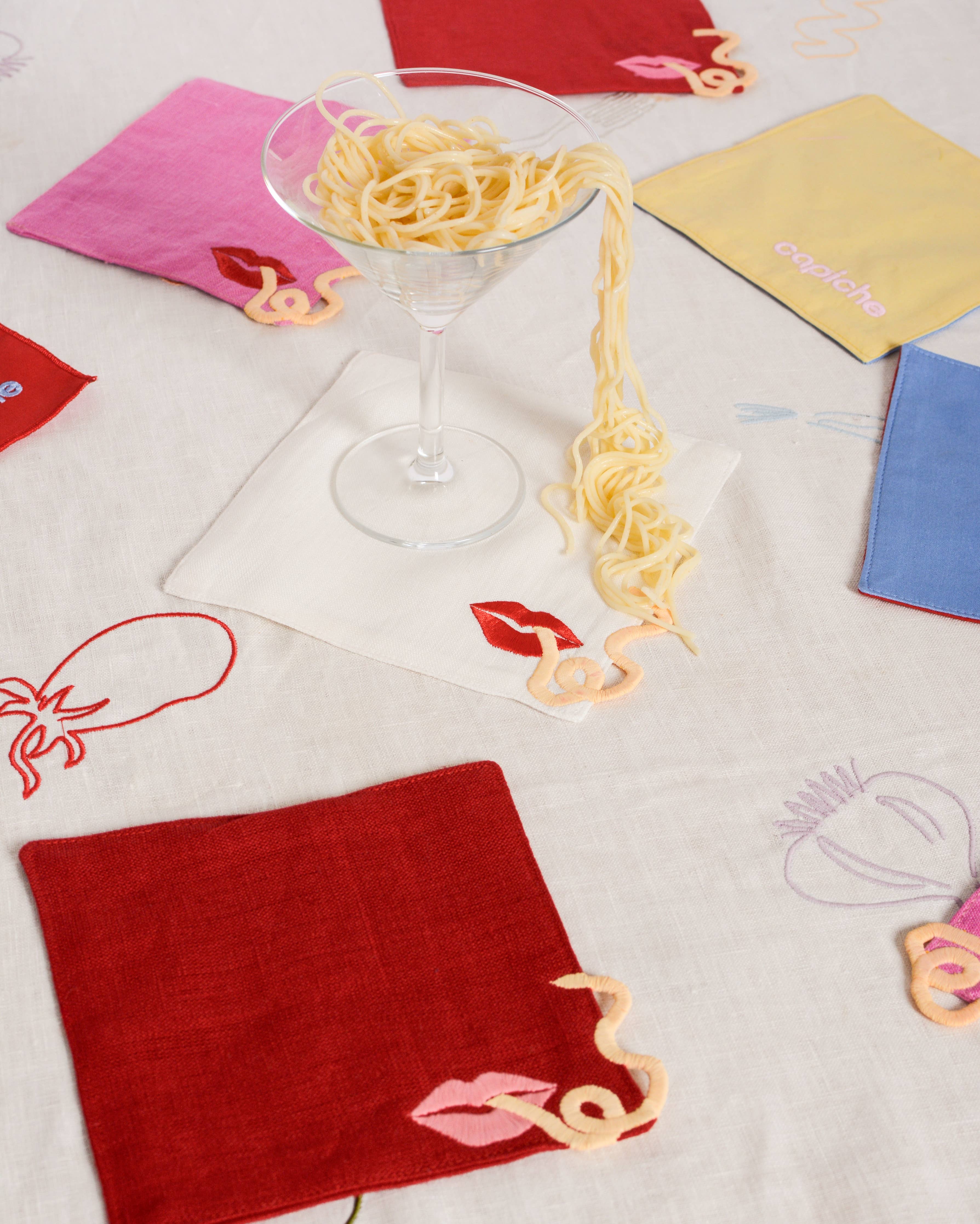 Our Pasta Slurp Linen Cocktail Napkins feature a playful lip and noodle embroidered design. With a magical effect being created by the noodle appearing to float off the napkin. These napkins are an ideal hostess gift and the perfect addition to any happy hour. Offered in sets of 2