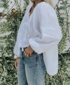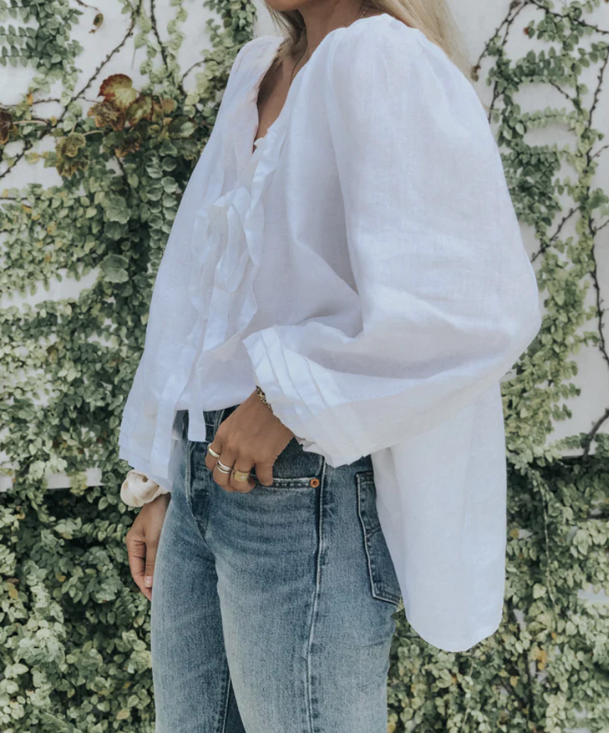 The Sammie blouse is crafted from airy linen, subtly gathered at the neckline to create a billowy silhouette and detailed with pin tuck cuff on a flouncy balloon sleeve. Wear yours with jeans or tailored pants.