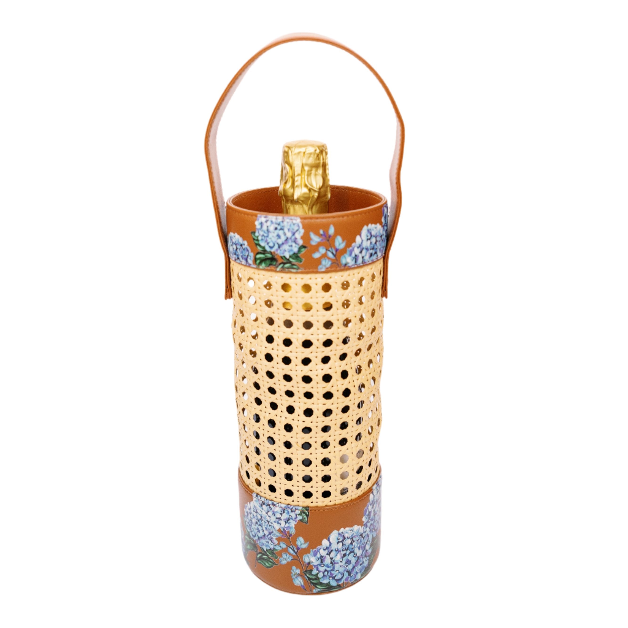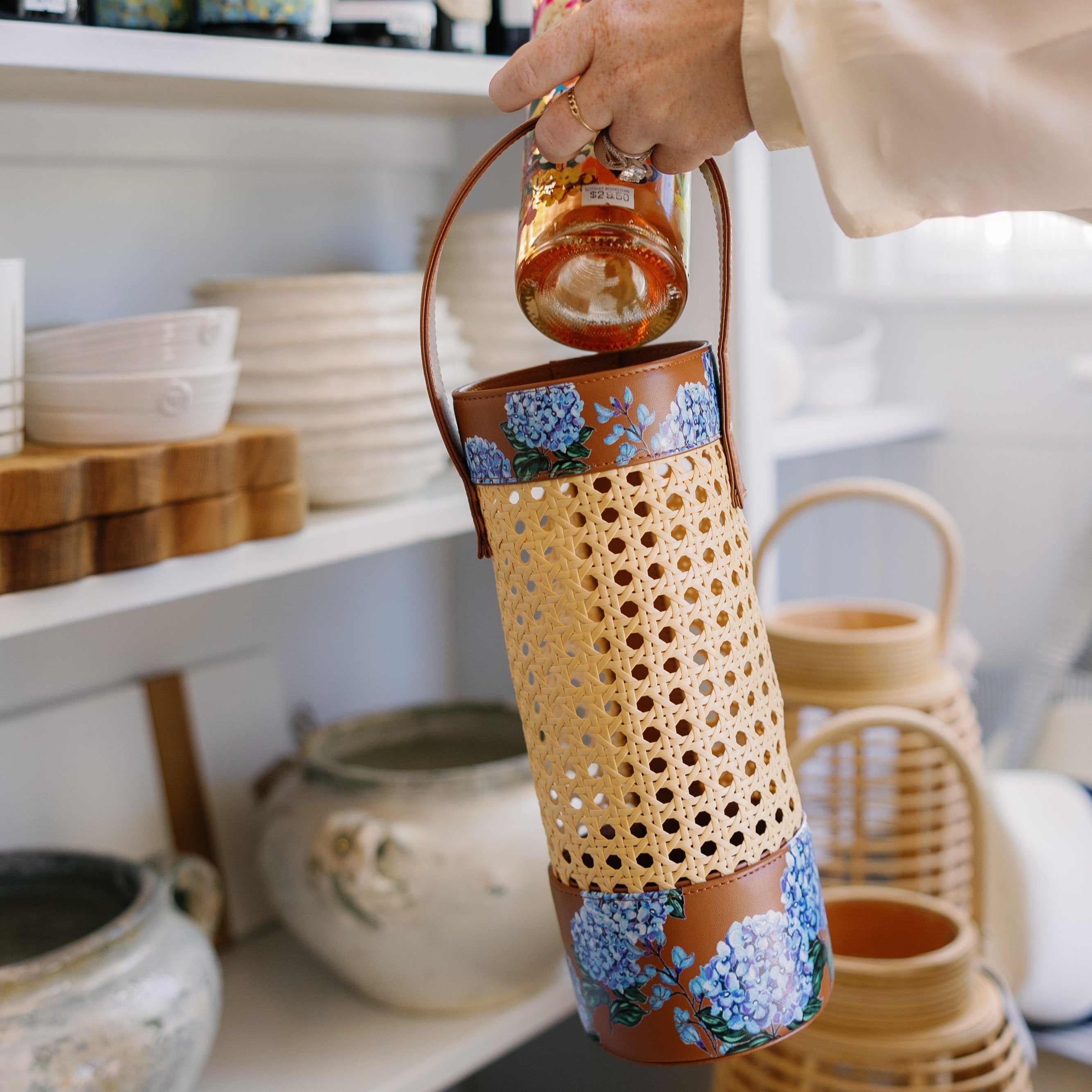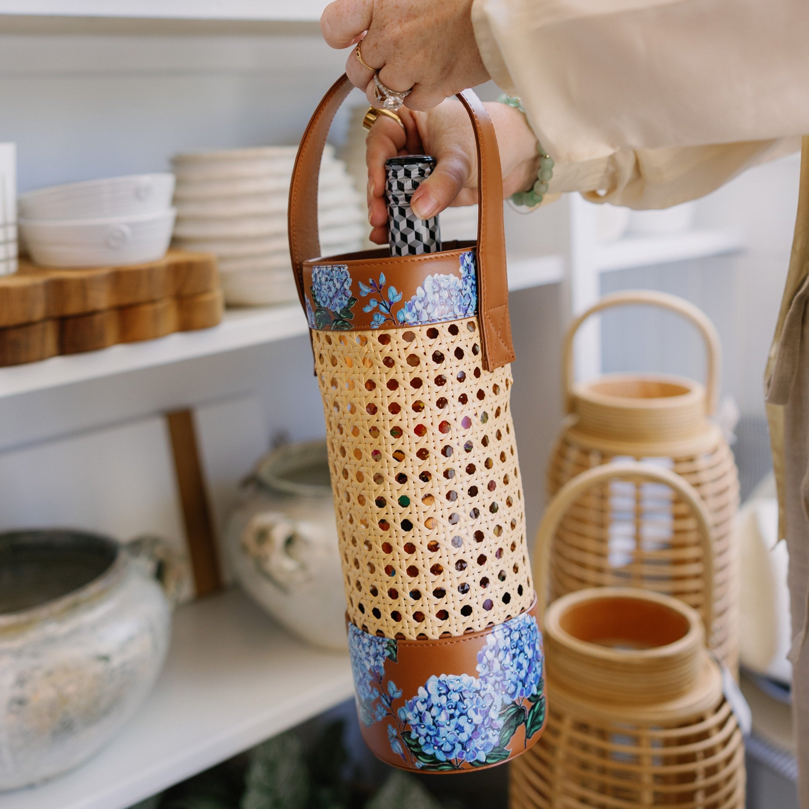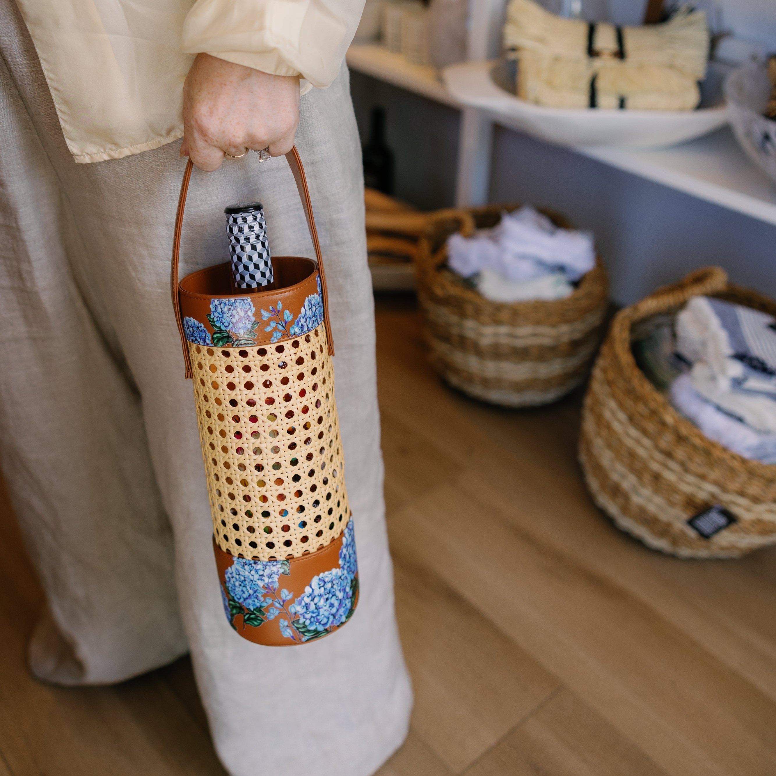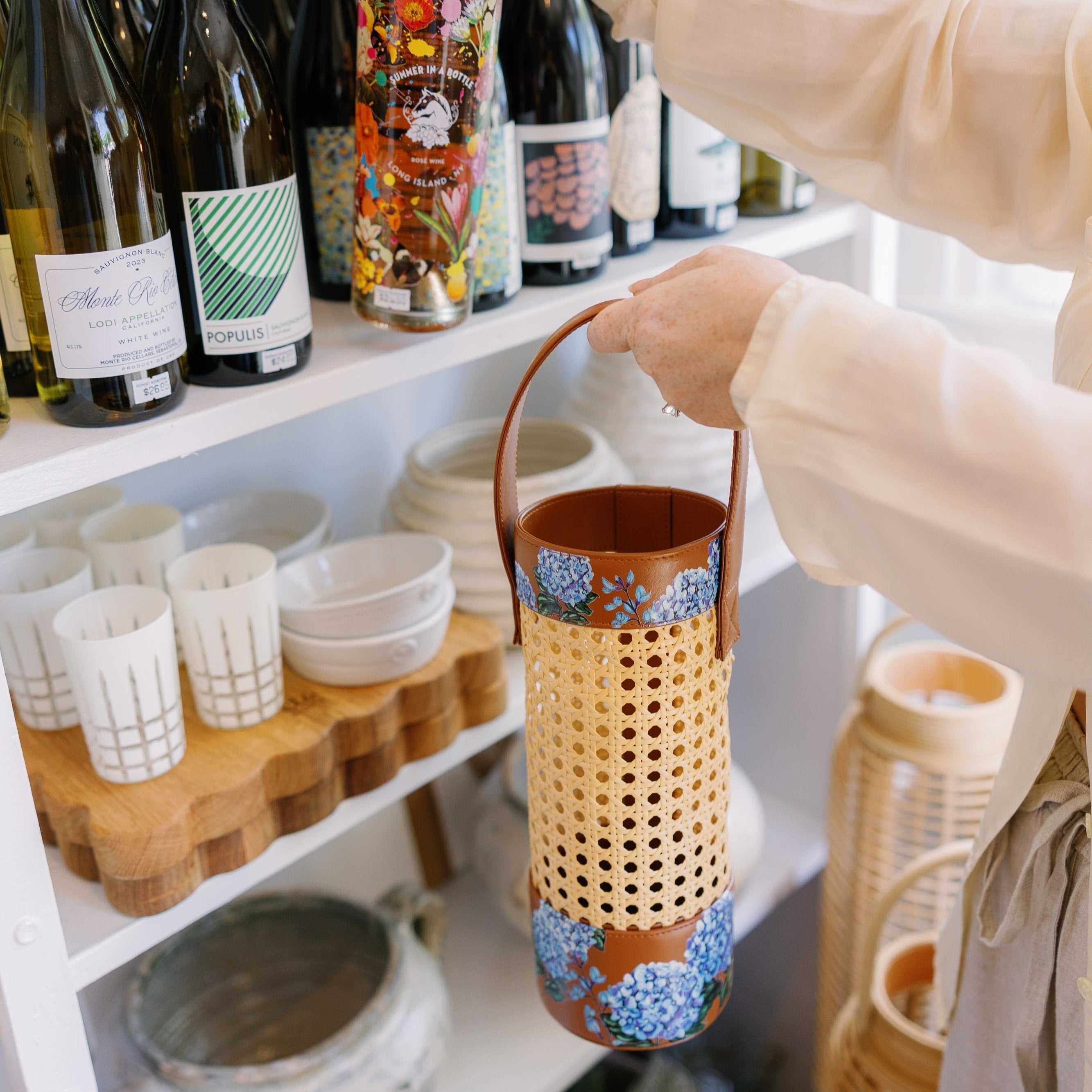 A For Now exclusive, this wine tote that pairs well with any bottle. Made with leather and rattan, the Nantucket Wine Bag is a special collaboration with Alepel. The artwork is inspired by the island's iconic hydrangeas—digitally painted using Alepel's unique UV technology with hand-painted metallic accents.