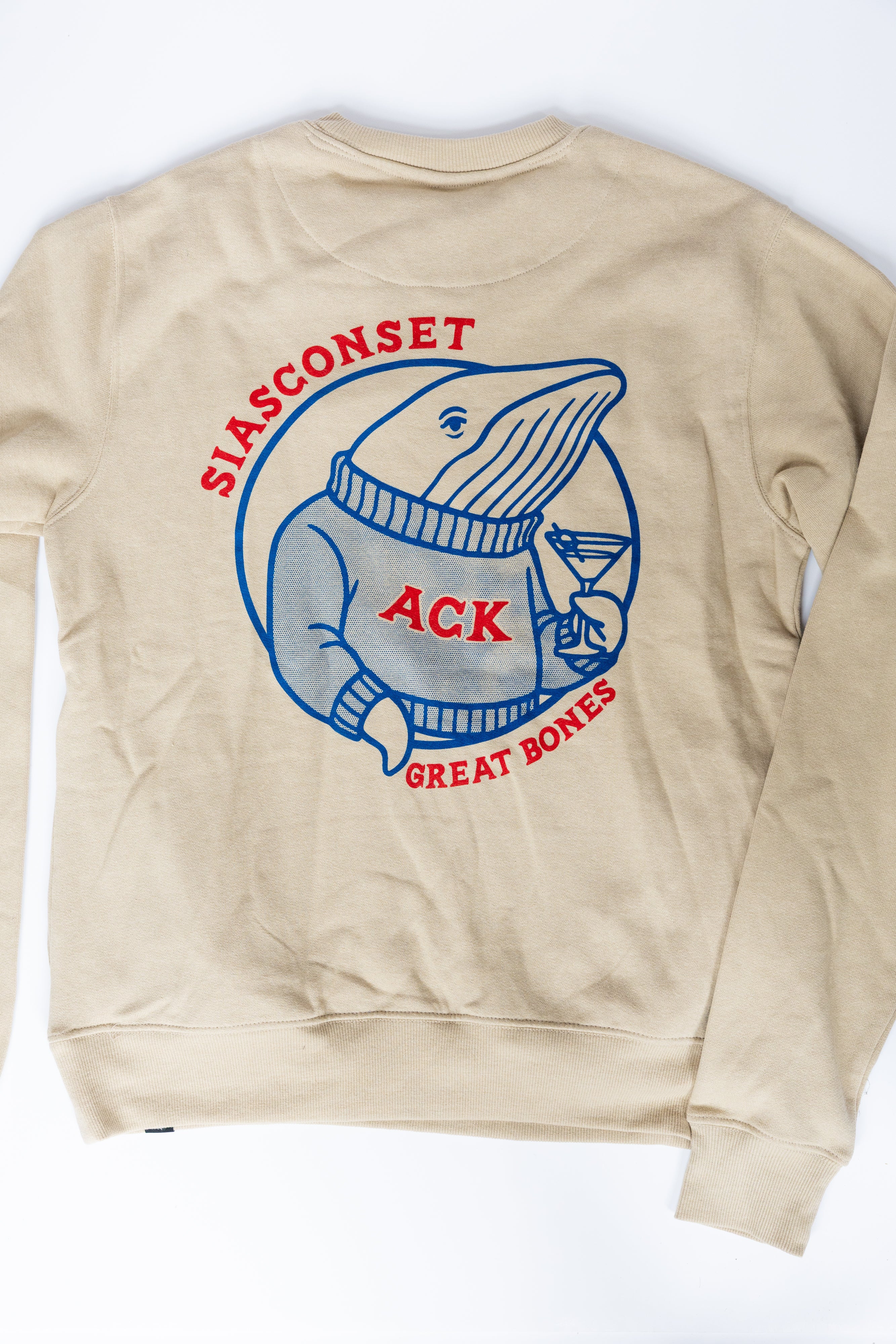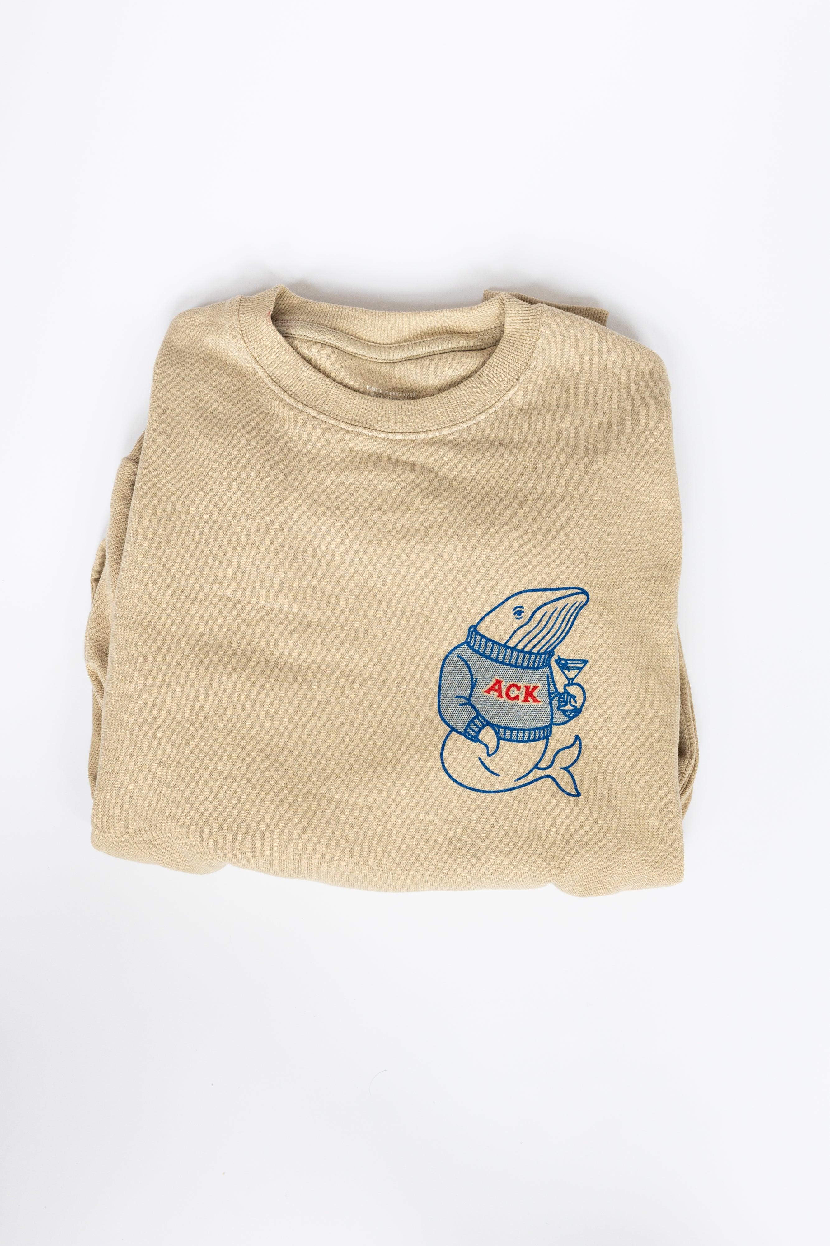 This cozy khaki crew features our dear Martini Whale - the mascot from our summer pop up in 'Sconset. The pop-up exclusive is now live For the holidays in limited quantities.