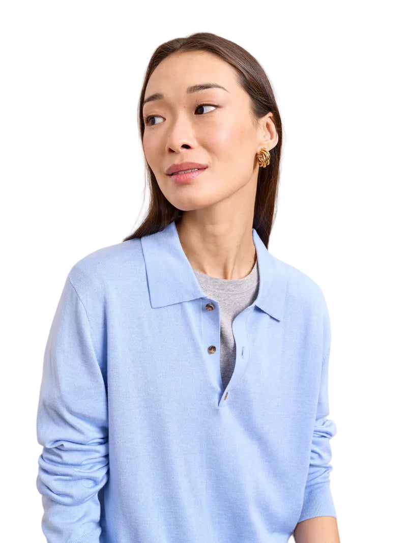 La Ligne's newest lightweight silk/cashmere blend polo sweater is For everyone. We are obsessed with the effortless long sleeve polo knit, the perfect touch for any look. Inspired by a clean and classic aesthetic, this unisex, light blue polo sweater will always have a place in your closet, and potentially your partner's. After all, sharing is caring.