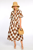 The Collins Dress in Brown Gingham is a statement piece that combines sophistication with femininity. Her fitted torso is beautifully balanced by dramatic sleeves and a full skirt, polished with a matching belt buckle.