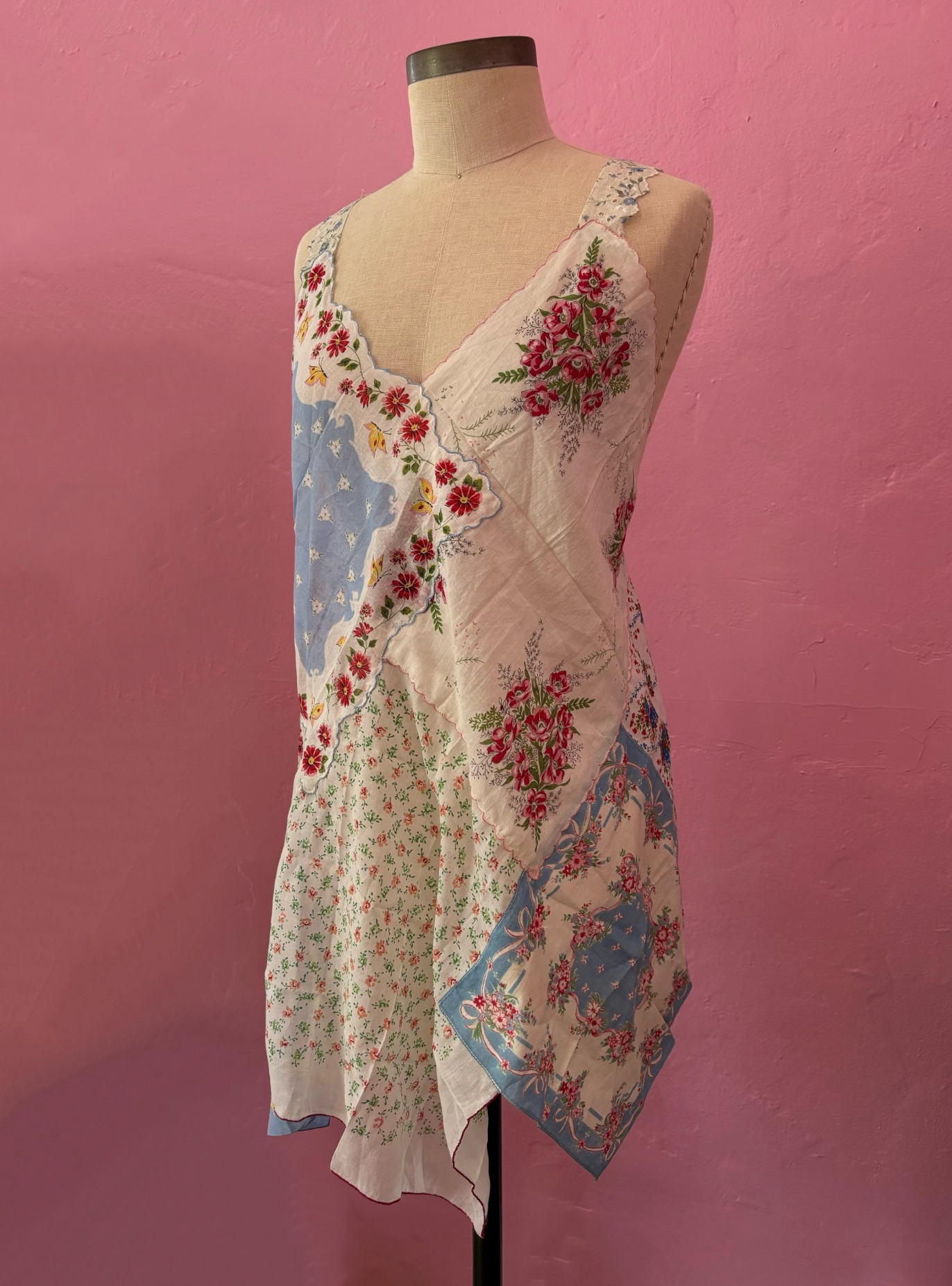 This one-of-a-kind draped dress was created out of vintage hankies, napkins, and label linens. It fits loosely and has a low back, made to give flower fairy vibes.