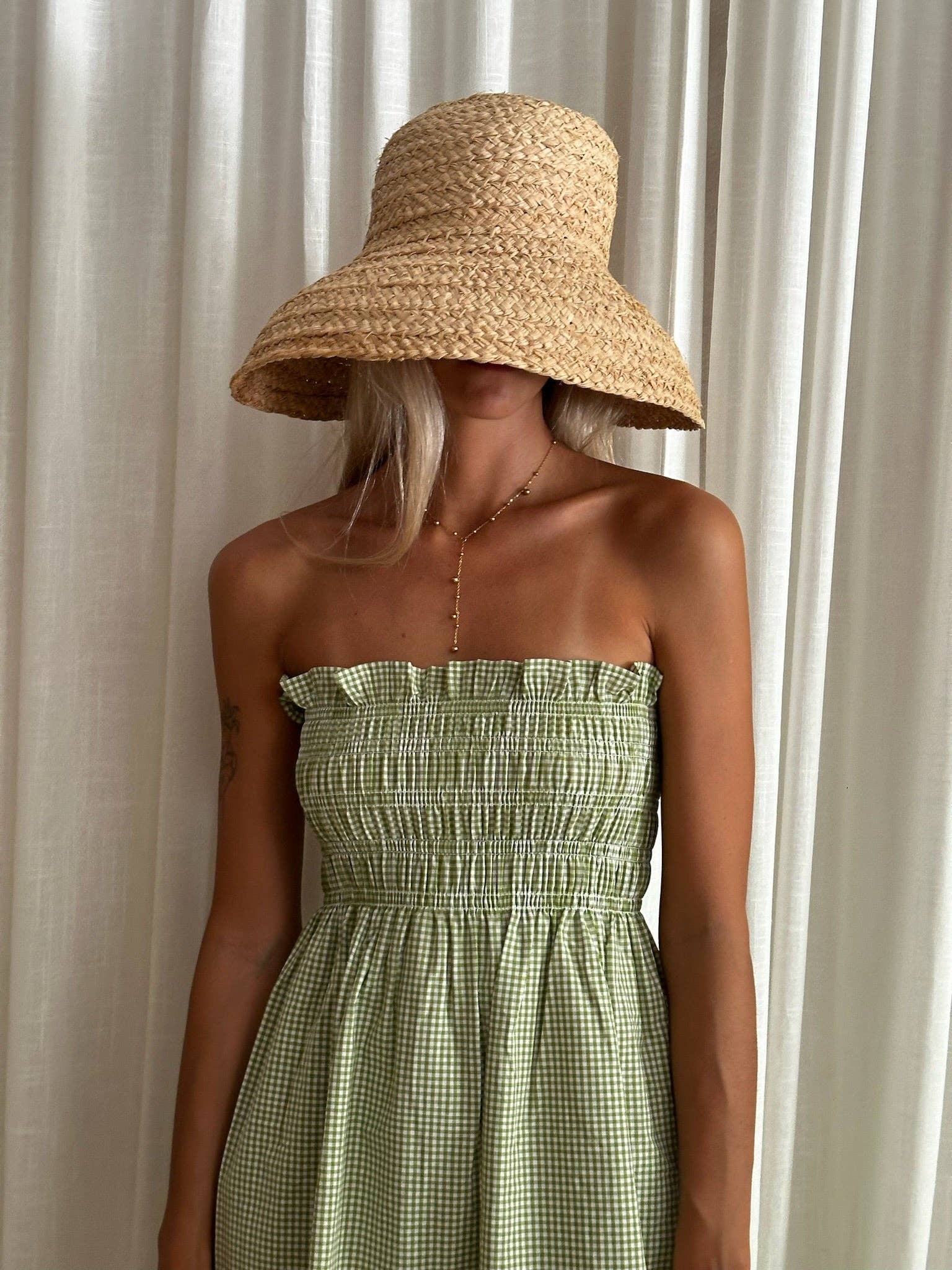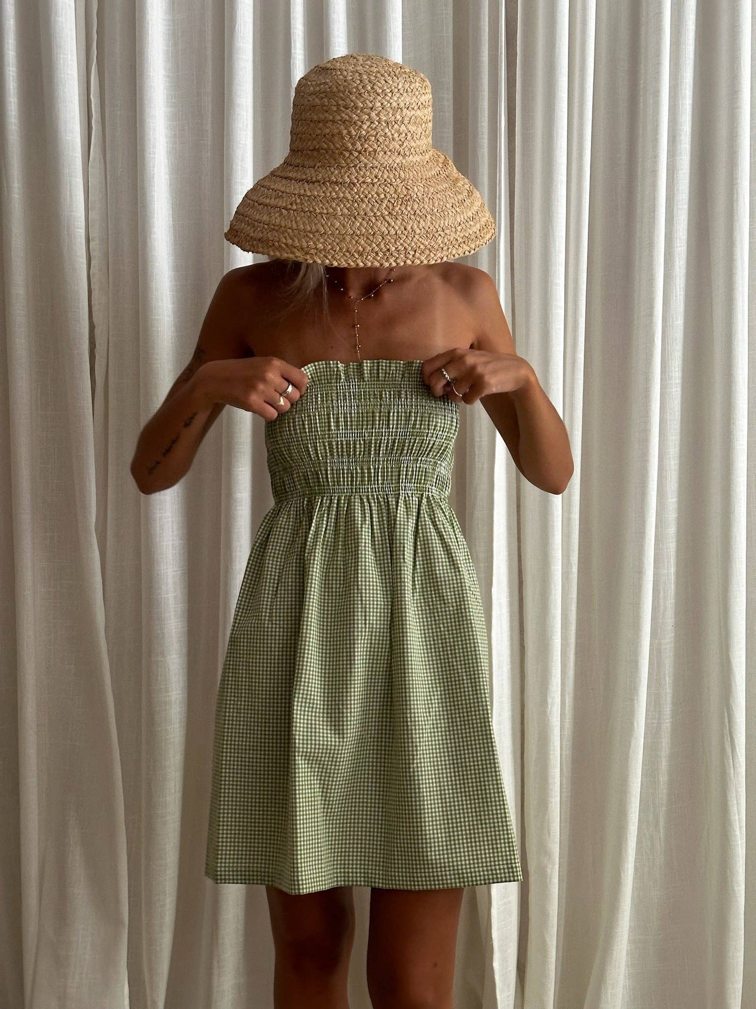The Teressa is a strapless cotton dress with a fitted silhouette. Elasticated bands at the chest and waist create delicate ruffles, adding texture and dimension for a playful yet elegant look. Perfect for a hot summer day.