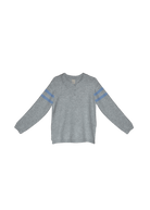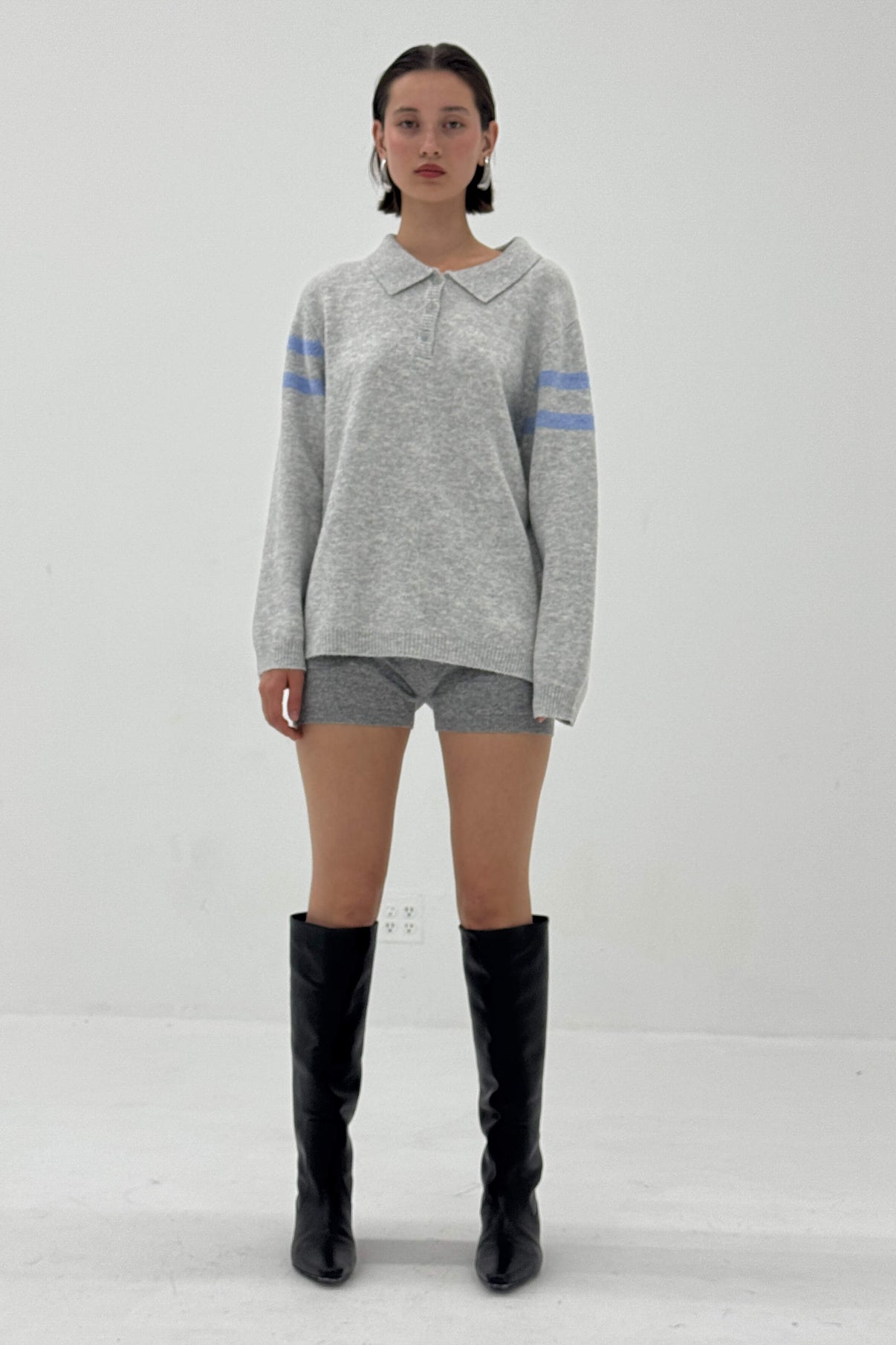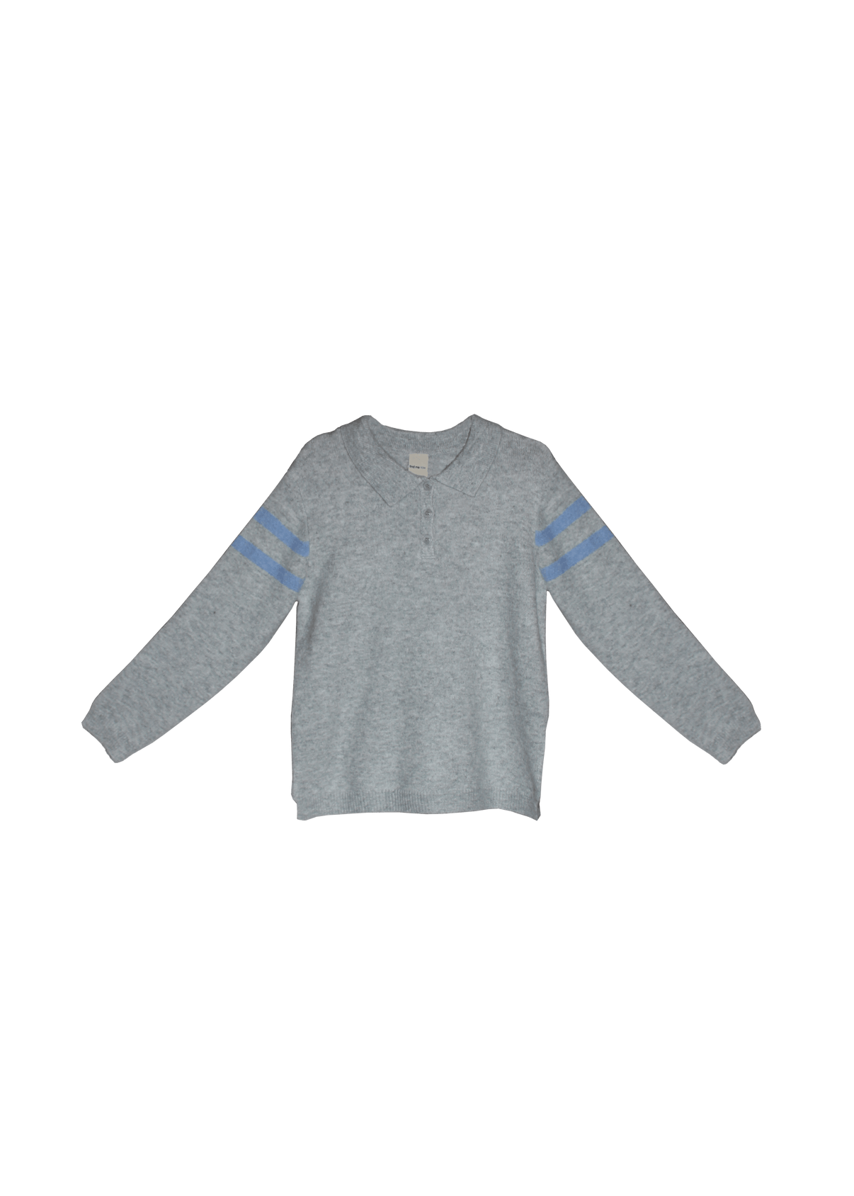 The Recycled Knit Stripe Oversized Polo Sweater in Heather Grey/Cotton Blue is knit from a durable, wrinkle-resistant double ply recycled yarn with a soft hand feel, featuring a timeless polo collar and subtle stripes. Fitted through the body with a classic collar and contrast sleeve stripes. Easy to wash, made to last, and finished with subtle stretch for all-day comfort.