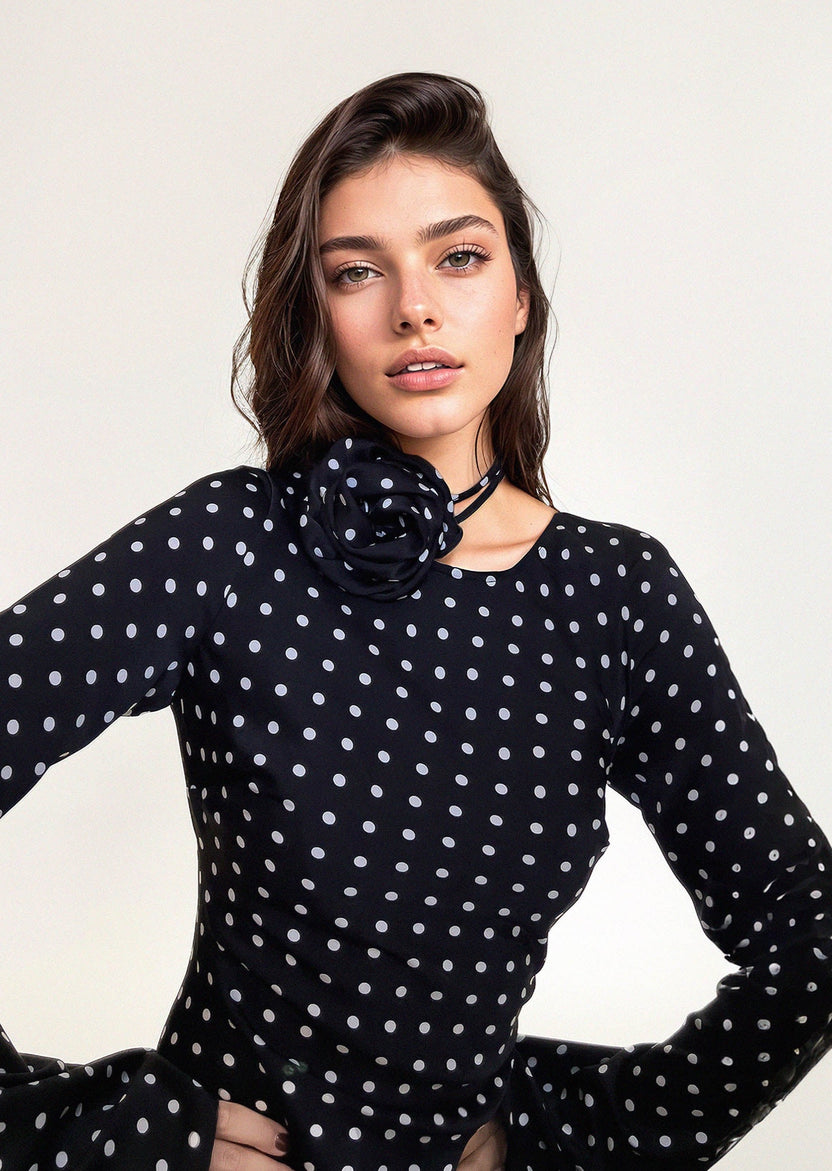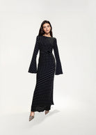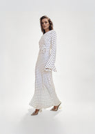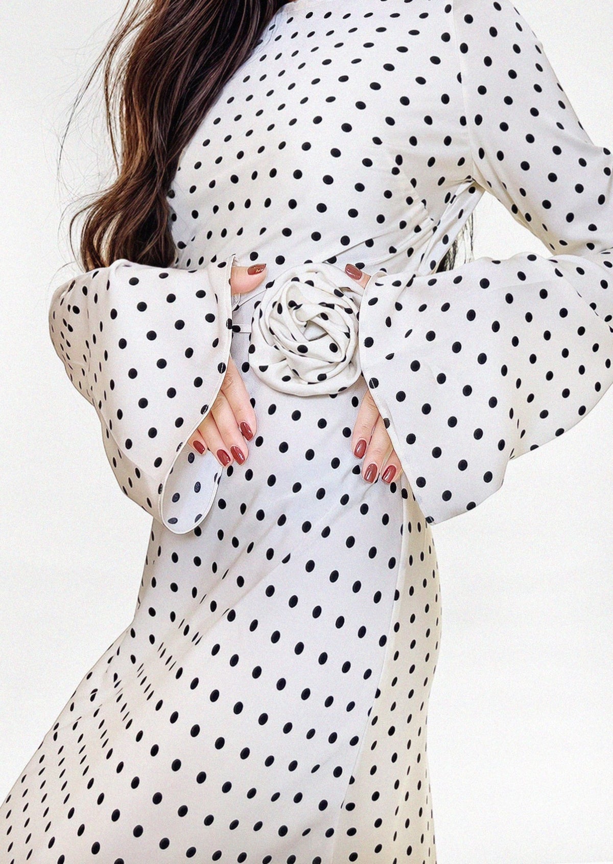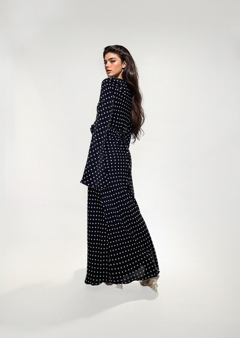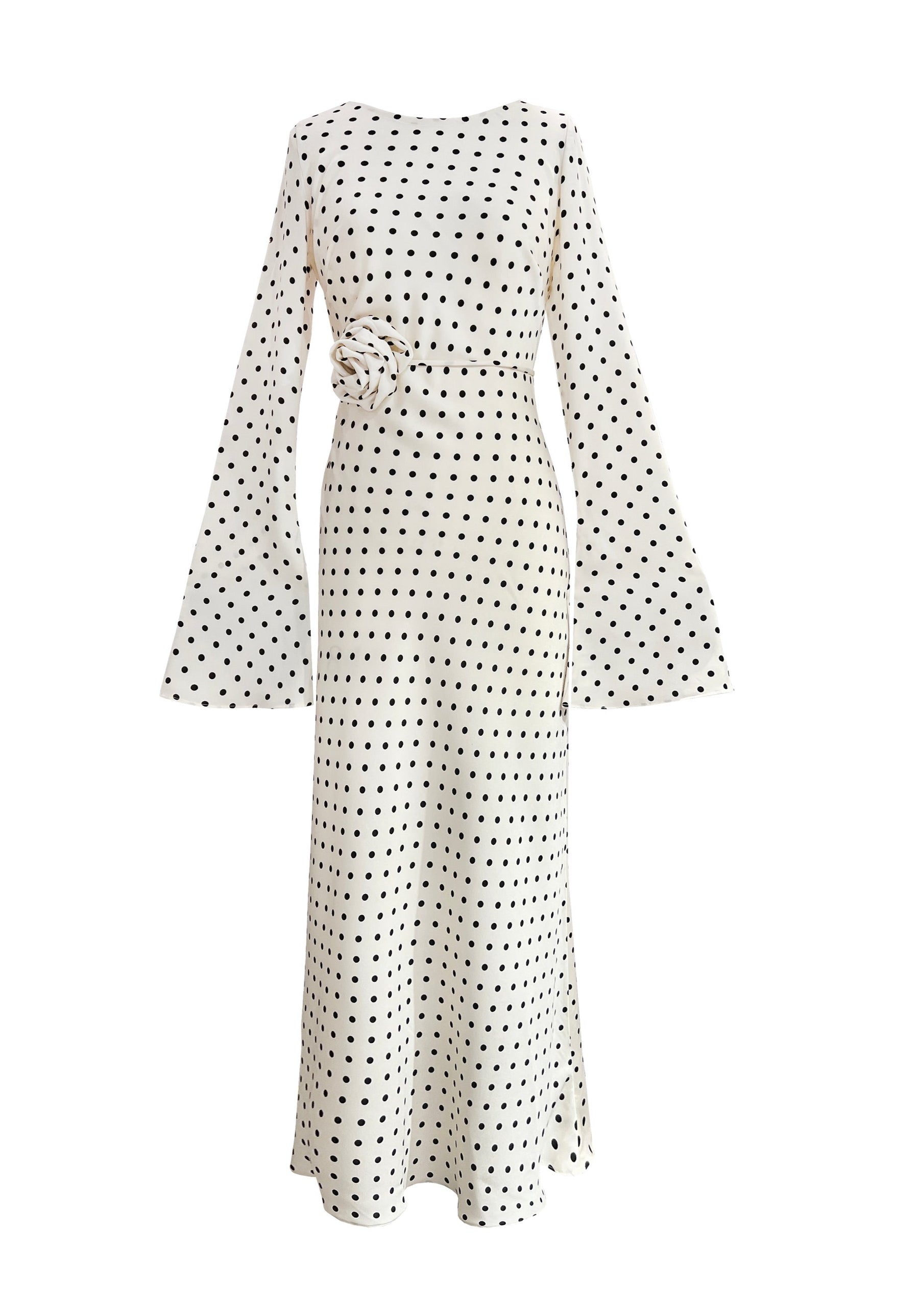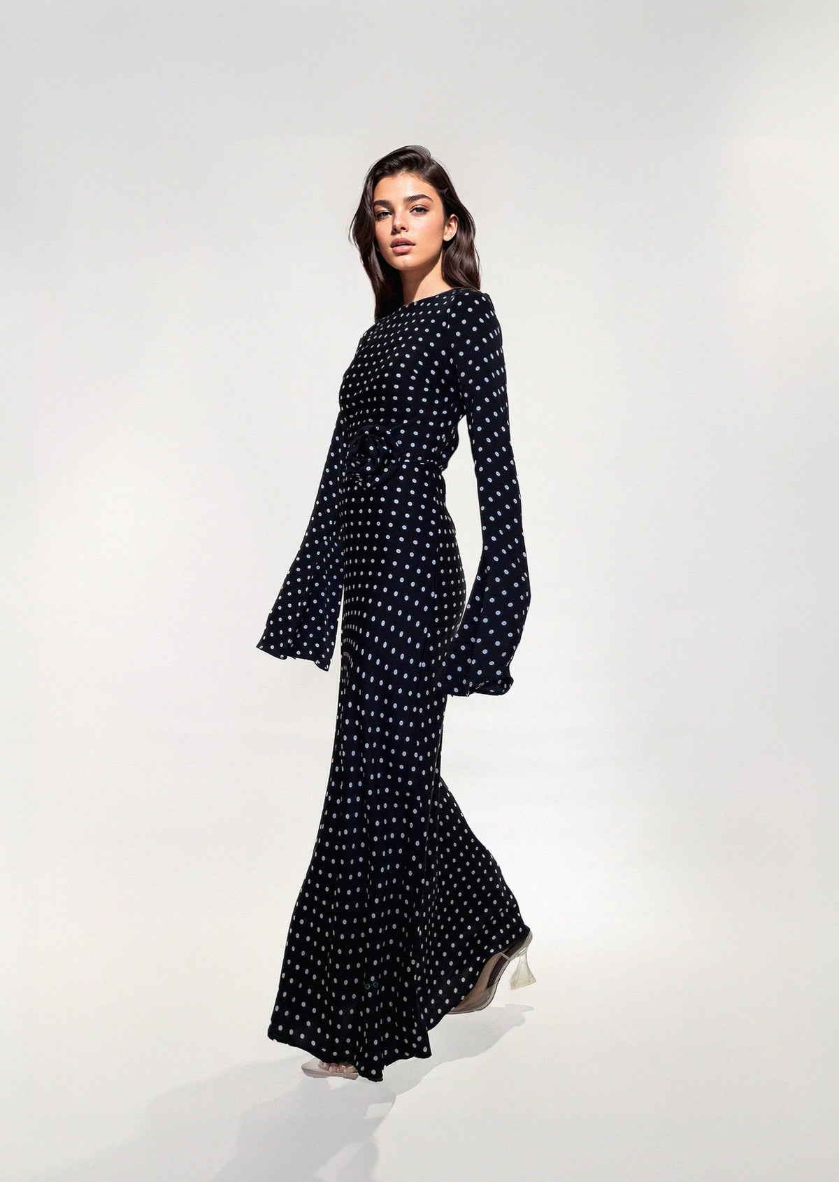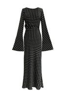 Channel the iconic 70s vibe with the head-turning Kyra Dress, a bias-cut design that's endlessly flattering. Ideal For winning best-dressed guest at every holiday soirée. The statement flare sleeves and maxi length give it a fluid, elegant look that’s effortlessly chic. Pick between classic Black Polka Dots or fun White Polka Dots to perfect your vintage-inspired style For fancy nights.