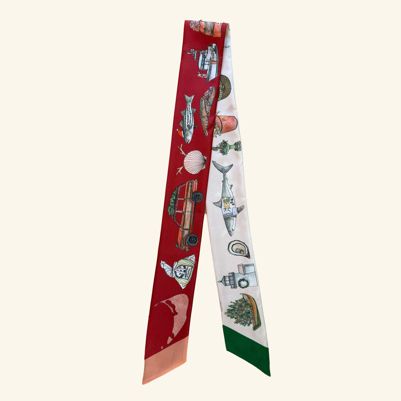 Celebrate the magic of Nantucket Stroll with the limited-edition Stroll Twilly. Hand-illustrated with iconic Stroll moments — from the iconic Stroll Dory Boat to vintage Christmas Tree Wagoneer — this twilly is a nostalgic nod to the season and all the traditions that make Nantucket magical.