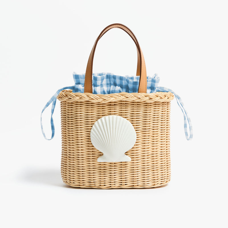 - Handwoven rattan basket with leather handles, gingham lining, removable pouch and resin shell sourced from Italy