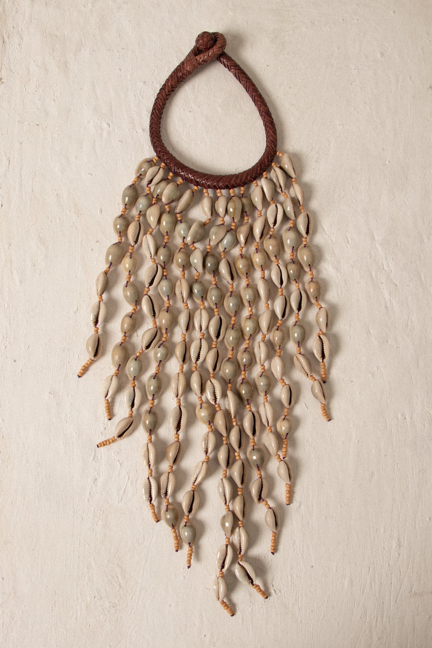 The piece is made of natural shells, warm beige beads, and a hand-braided cord. Each design is unique.