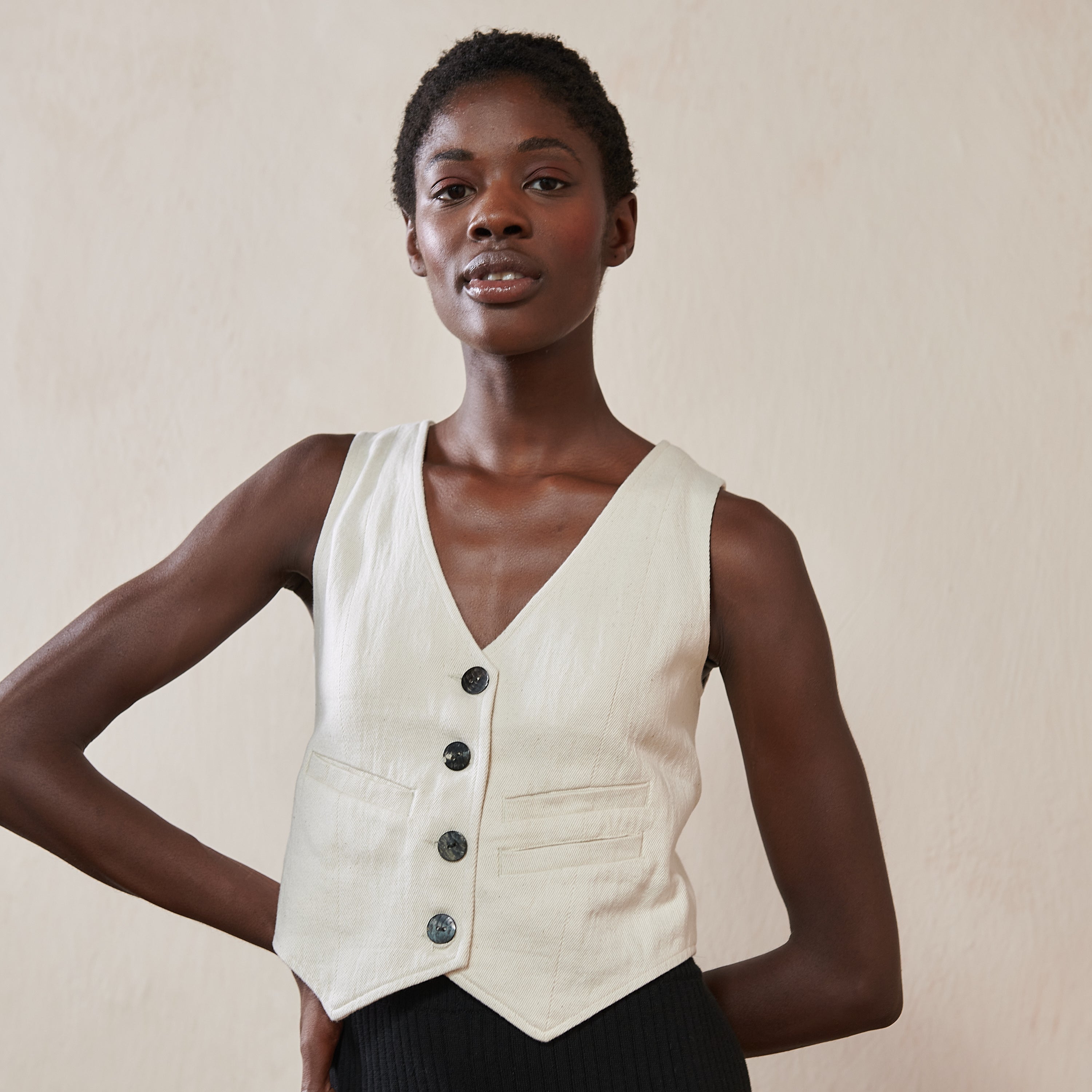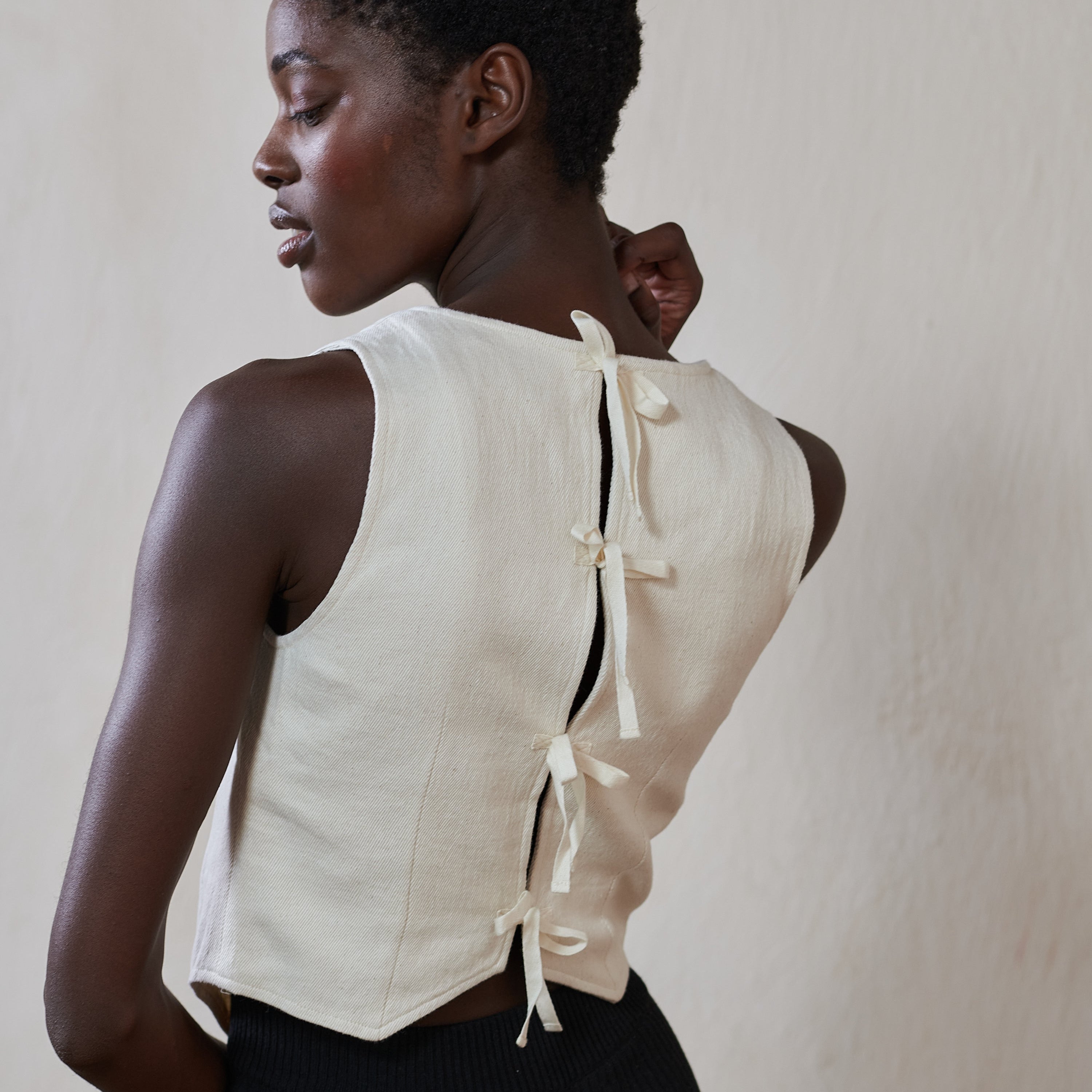 A fully lined menswear inspired vest, punctuated with feminine tailoring. A v-neckline and front welt pockets. Cotton twill tape ties up the back. Made from an organic 100% cotton selvedge denim, hand-loomed on wooden frame, without the use of electricity. Seashell buttons up the front.