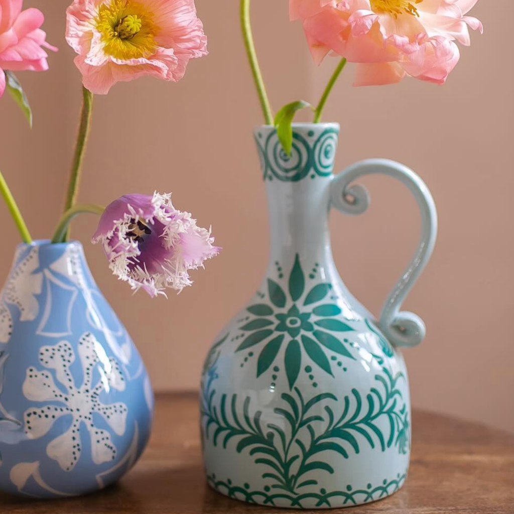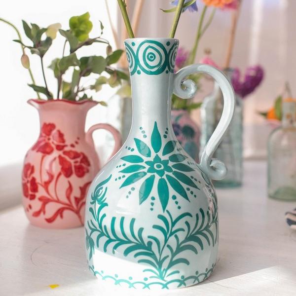 A vessel that transforms even a lone wildflower into an artistic statement. In seafoam green with emerald botanicals, it's the pottery equivalent of a perfectly timed wink.