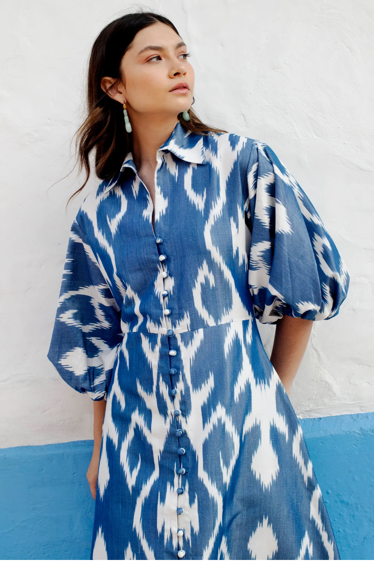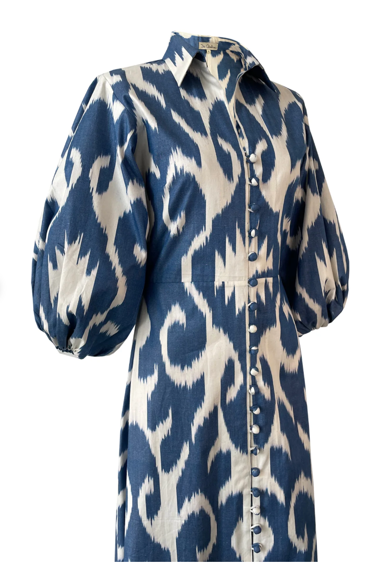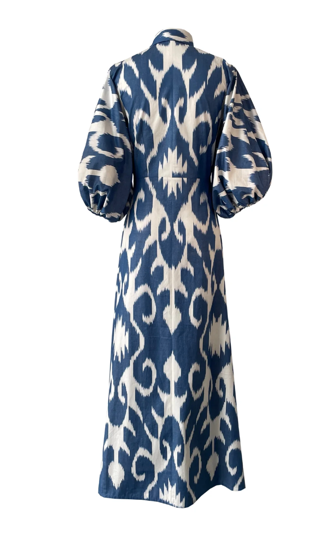 This exquisite dress features a beautiful contrast of white and blue, crafted from the finest handwoven silk sourced from the southern regions of India. The fitted design boasts a sophisticated, collared neckline and elegant ballon sleeves.