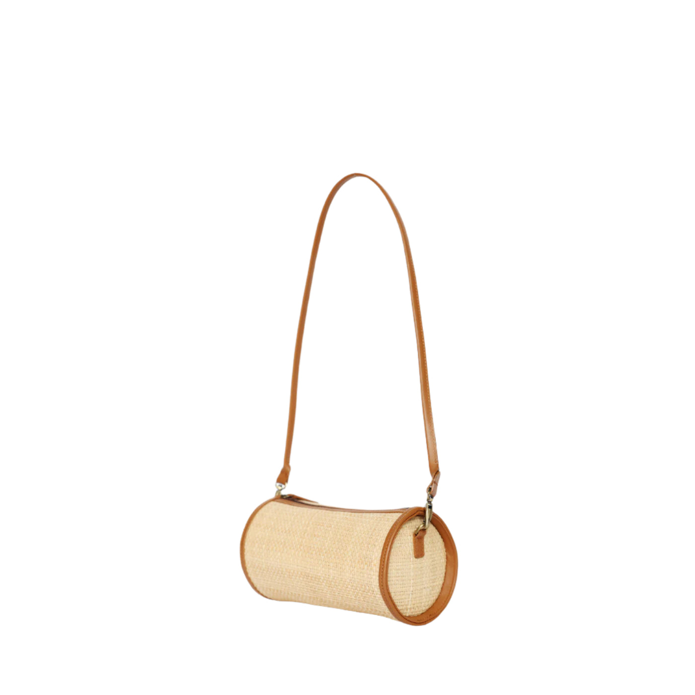 A cannoli-shaped raffia bag with leather trim and removable shoulder strap. Fits your phone and card case. Perfect for weddings and parties, or a little extra something in your day look.