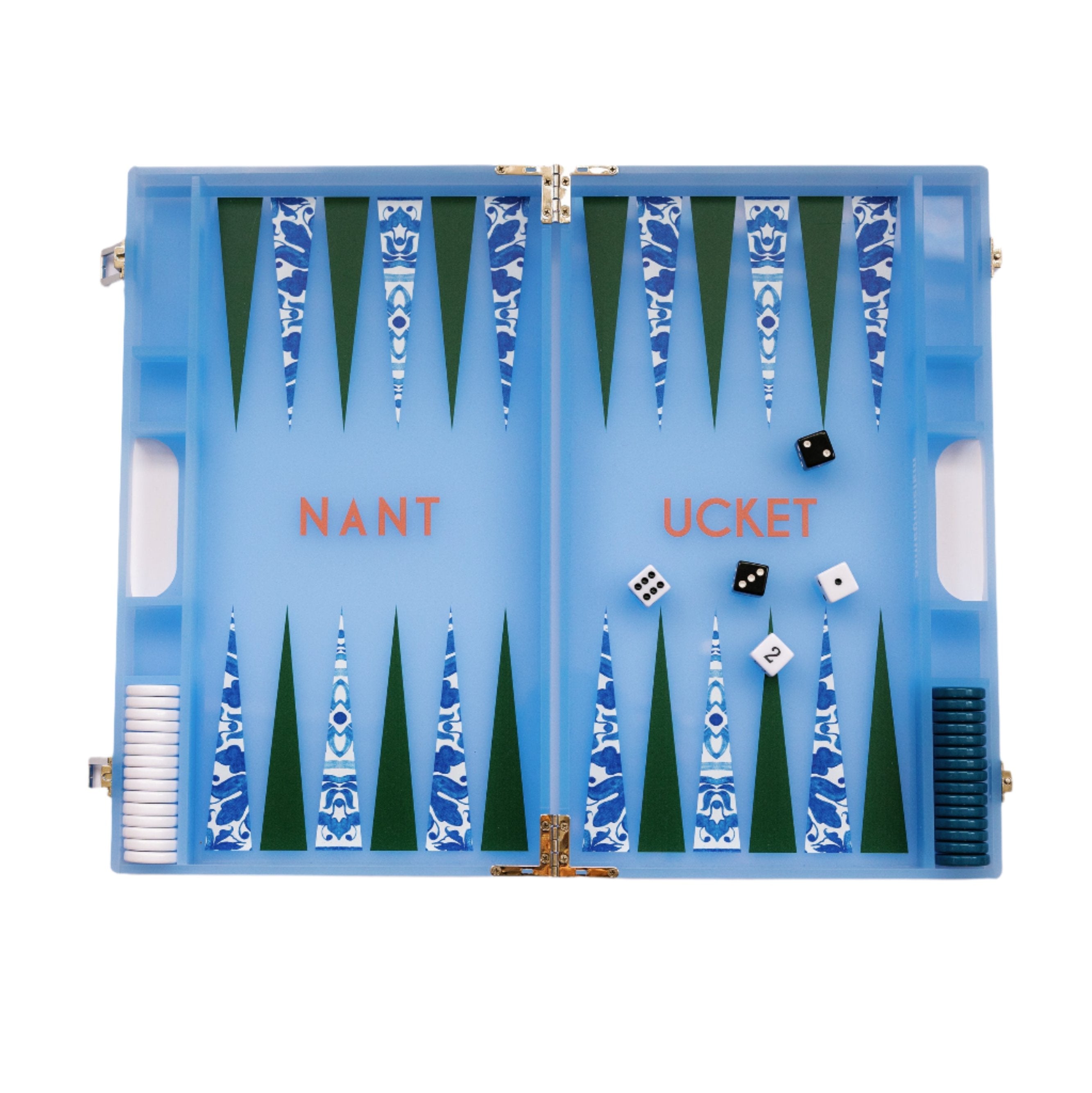 Decked out in Nantucket's signature blue with preppy green points and custom white toile patterns, this backgammon set is a beach house staple. The board cleverly splits "NANTUCKET" across its playing field—because why be subtle about your good taste?