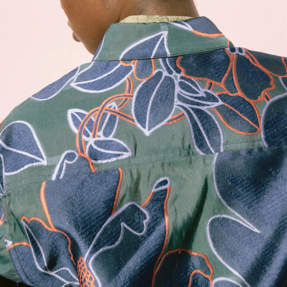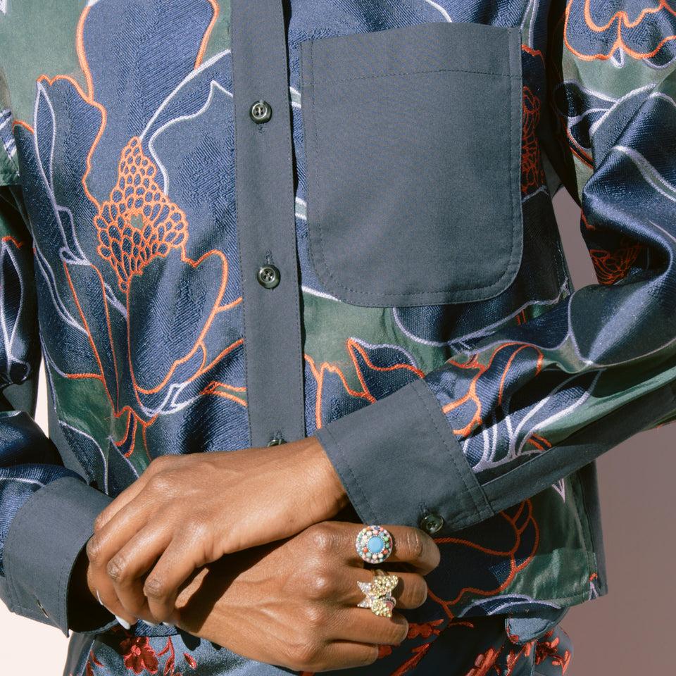 A special deadstock silk organza with big embroidered navy florals. The deep green is slightly sheer while the navy florals are a jacquard, and have a slight texture. This is not a print, but a special jacquard that makes for a unique piece. Paired with navy cuffs, pocket & placket. Deadstock buttons line center front and cuffs.