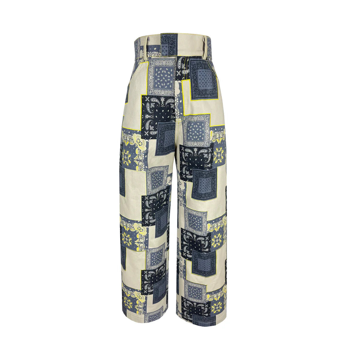 These stylish and comfortable boyfriend trousers boast a distinctive paisley patchwork design, featuring intricate embroidery throughout the fabric.