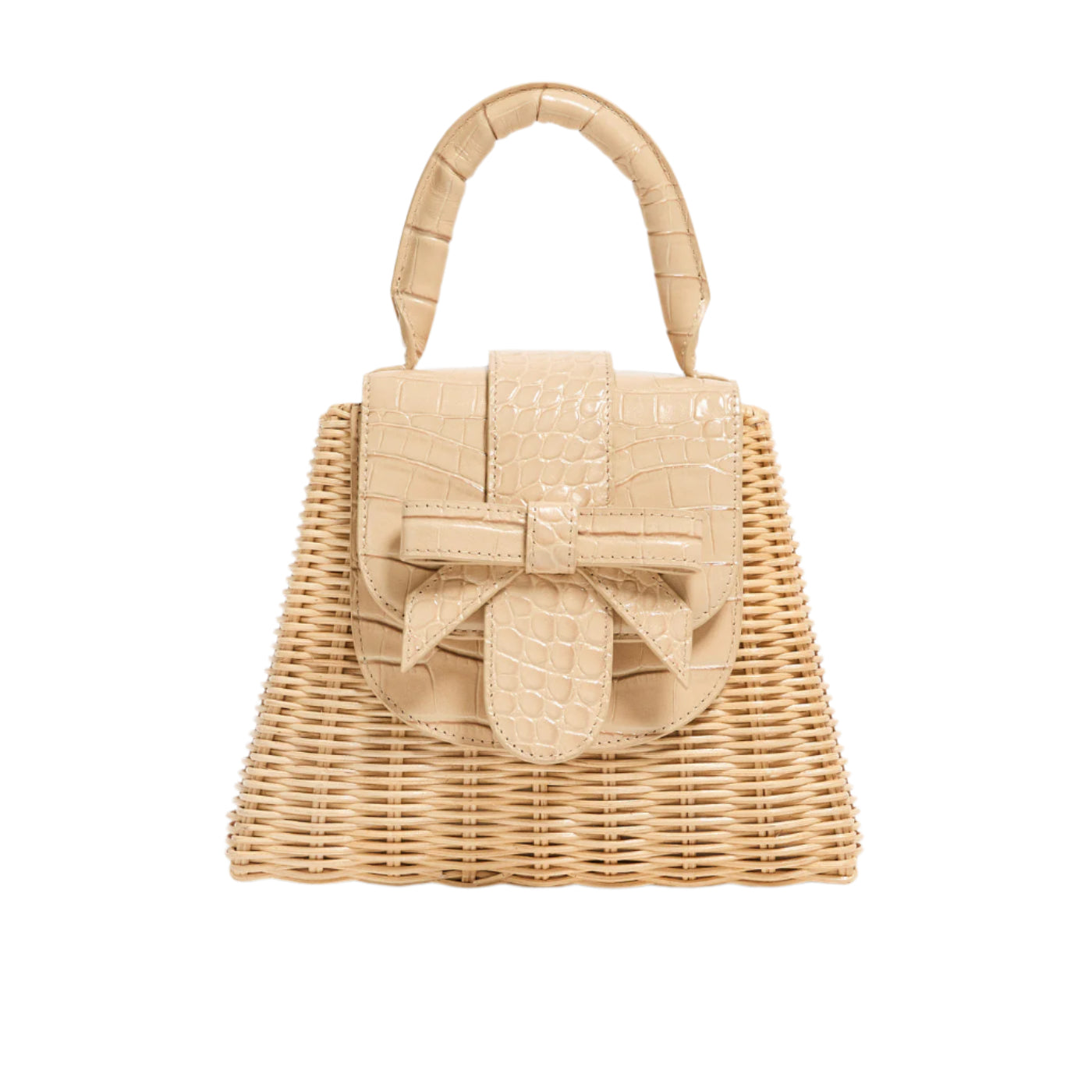 - Handwoven rattan small bag with croc-embossed leather top handle