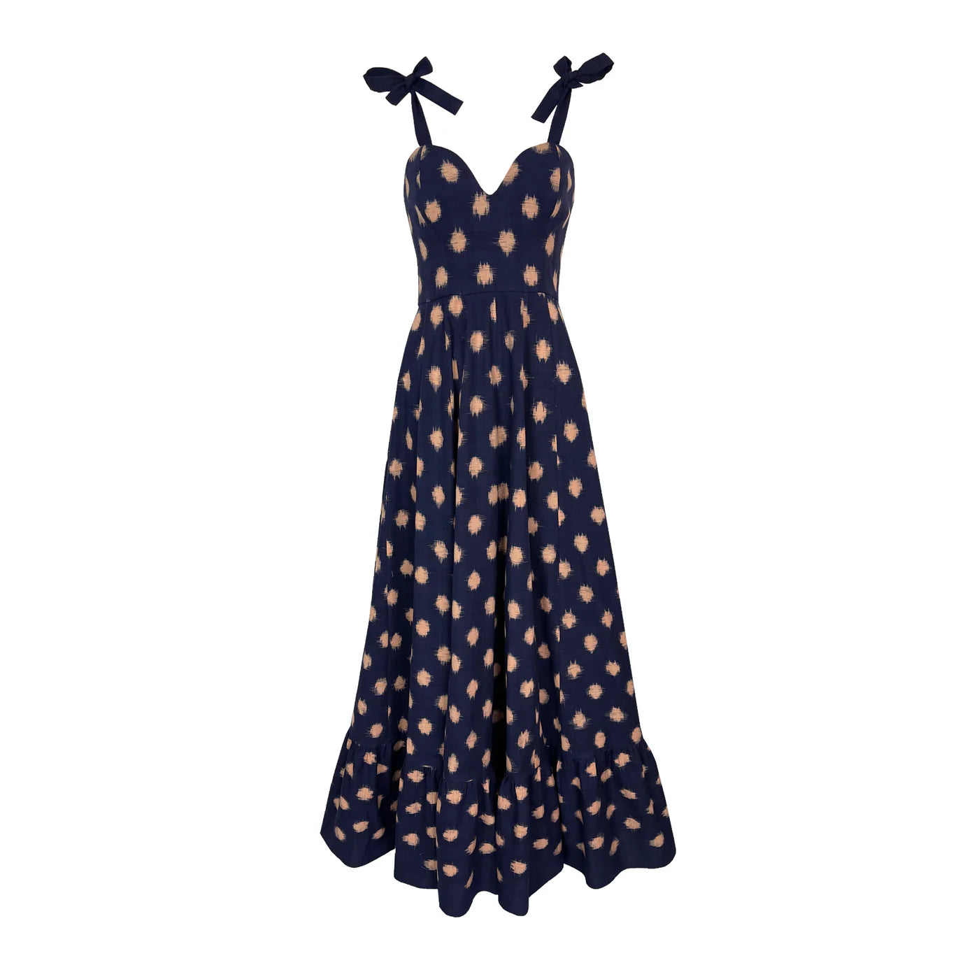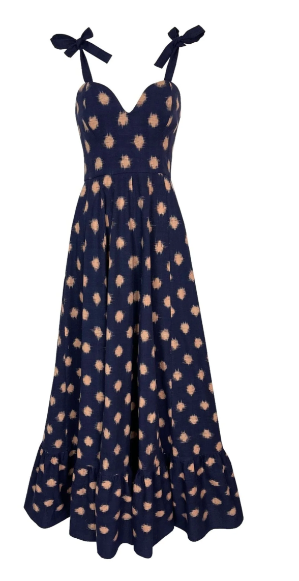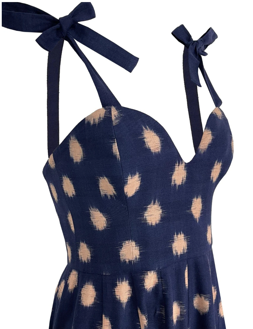 Experience the timeless elegance of our navy blue and pink Polka Dot Dress. Expertly crafted with handloom Ikat fabric from the south of India, this dress features a cinched waist with a round heart-shaped neckline, a beautifully detailed corset bodice, and elegant lined panels. Delicate bow shoulder straps and a convenient zipper closure in the back add a touch of sophistication to this luxurious dress.