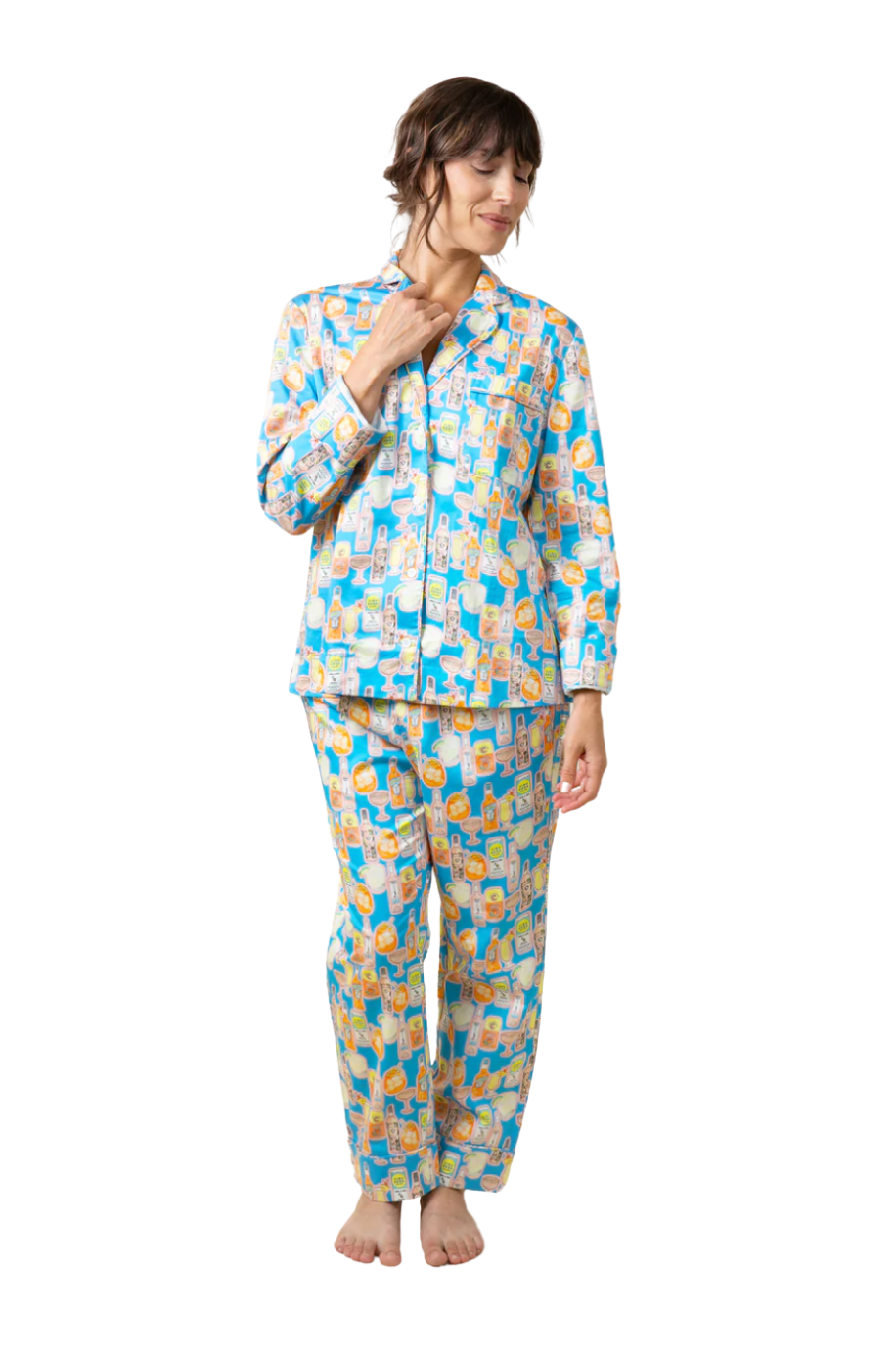 CJW's Classic Pajamas have a long-sleeved shirt with contrast piping on the sleeves and collar and straight-leg pants with a button closure and a stretchy, wide waistband that doesn't flip or constrict.