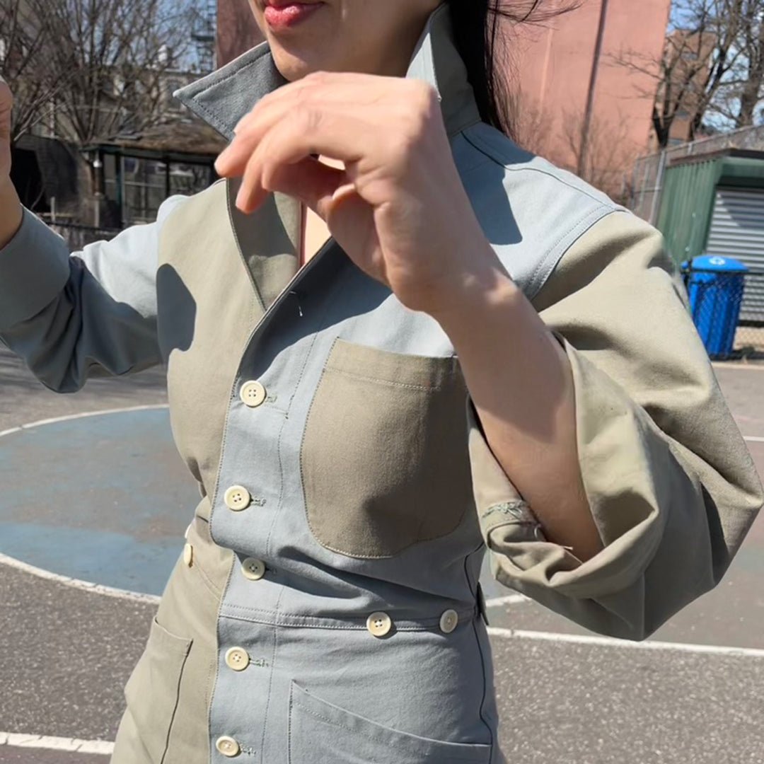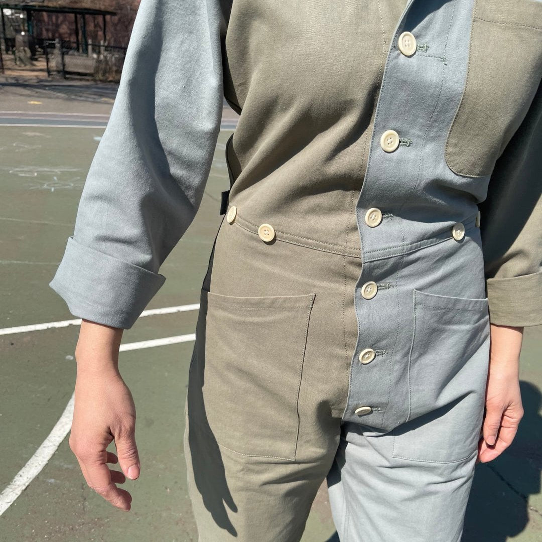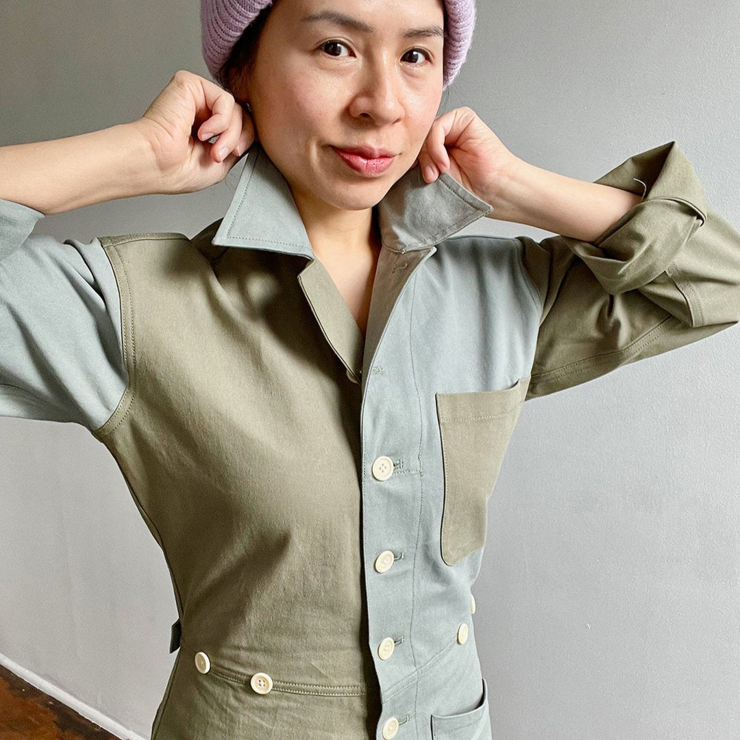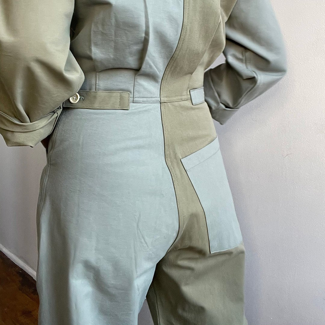 This boiler suit is made for movement and comfort, with darts at the back for a feminine touch. Contrast self at undercollar and sleeve cuff. Natural corozo buttons.