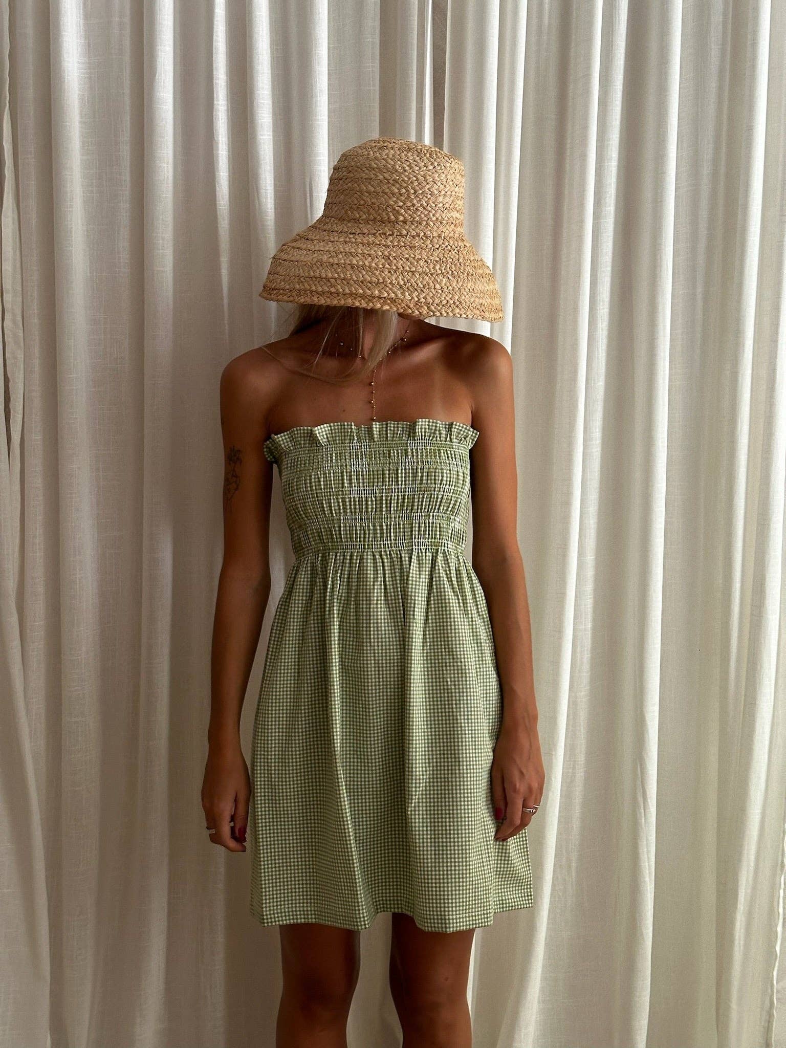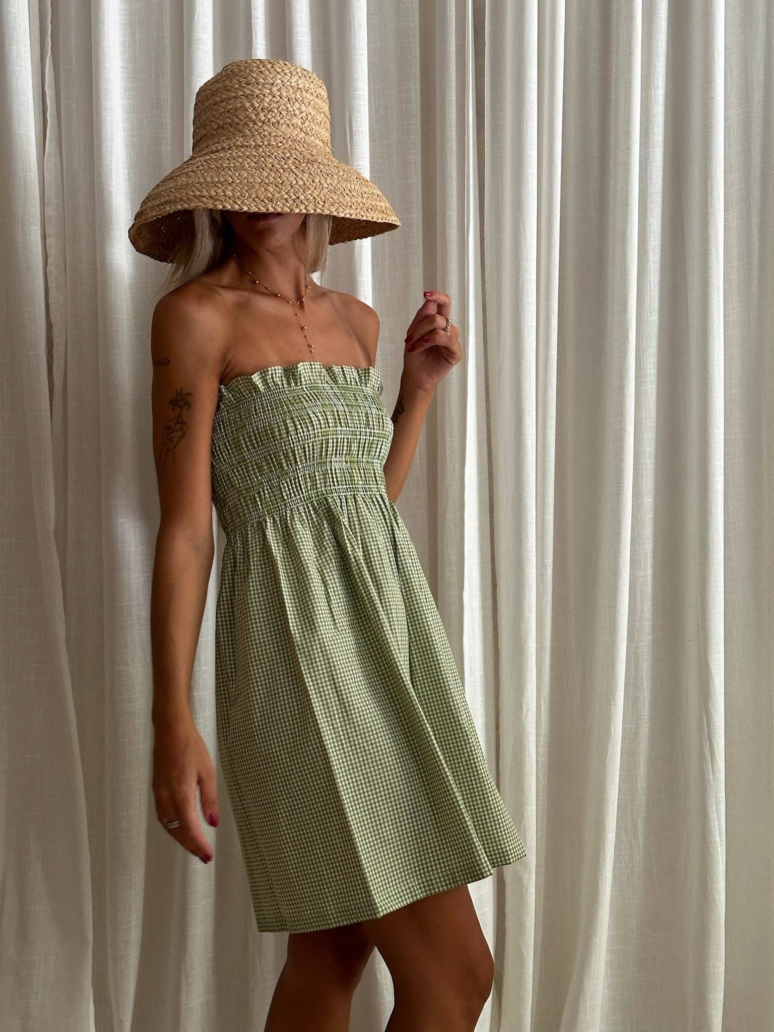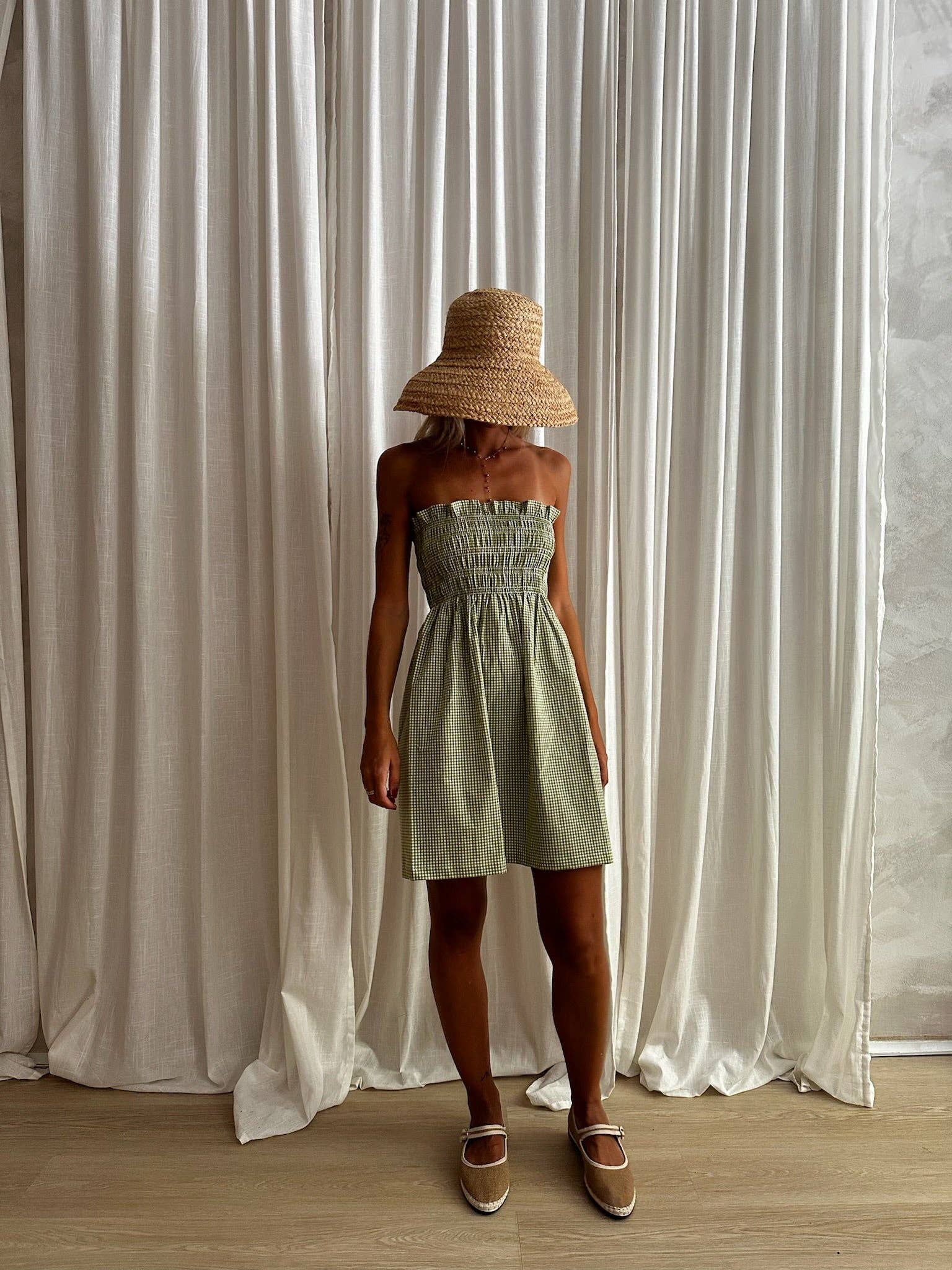 The Teressa is a strapless cotton dress with a fitted silhouette. Elasticated bands at the chest and waist create delicate ruffles, adding texture and dimension for a playful yet elegant look. Perfect for a hot summer day. Fabric: * 100% organic cotton. * Lightweight and breathable, perfect for year-round wear. Care Instructions: A good quality linen lasts a long time, but in order to ensure they will last for their maximum lifetime it is best to hand wash or machine wash on a low temperature (cold or lukewarm) with a mild detergent. A mild detergent would typically mean any detergent that is scent-dye free, a detergent designed for baby clothes, or a specific linen detergent. If the piece is from cotton we advise to hand wash or washing machine with cold water and little soap. Do not use the tumble dryer. We recommend to not leave the piece wet because otherwise it can stretch or get a different shape