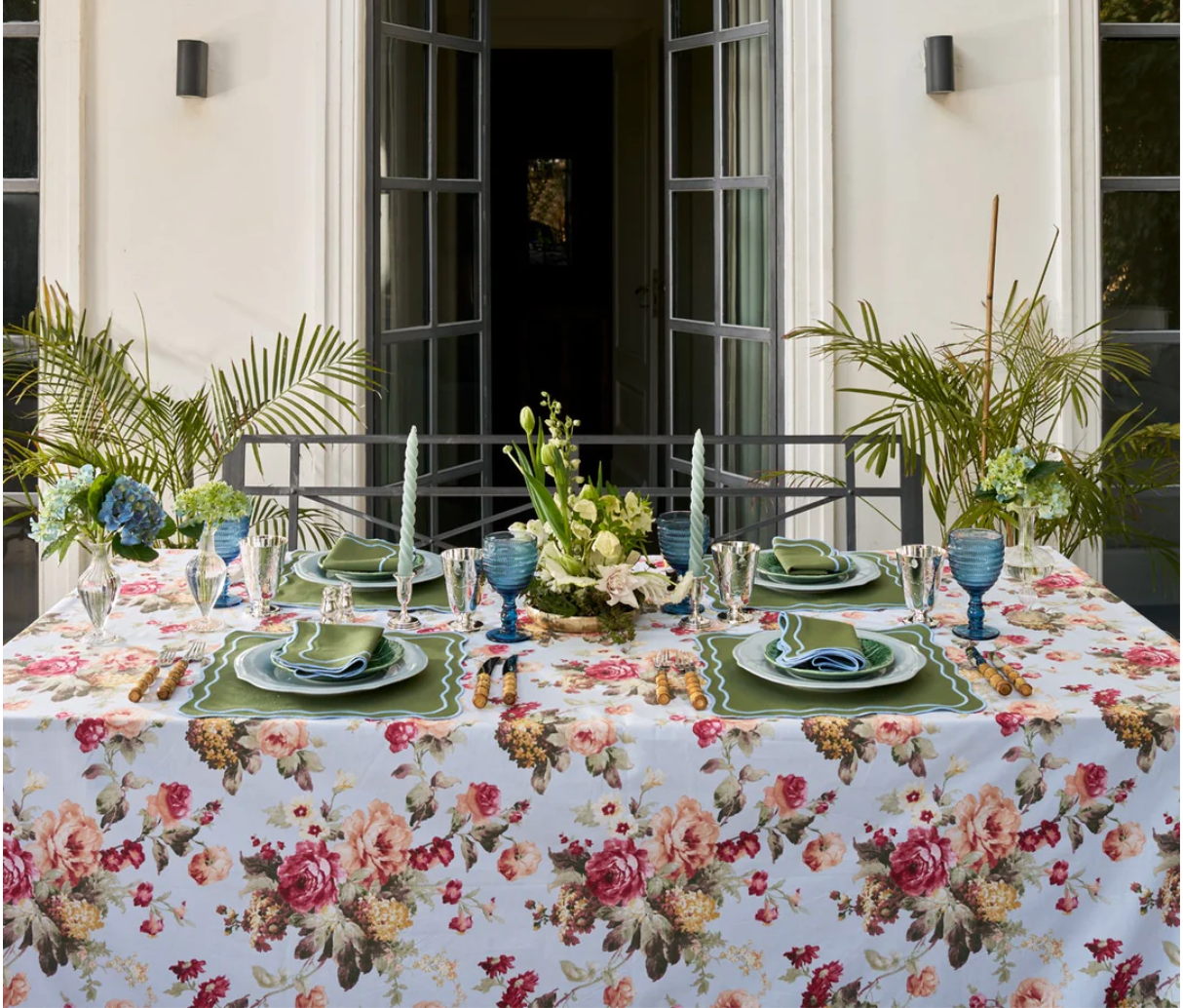 The Blue Wild Roses tablecloth makes it the perfect backdrop to your Soiree.