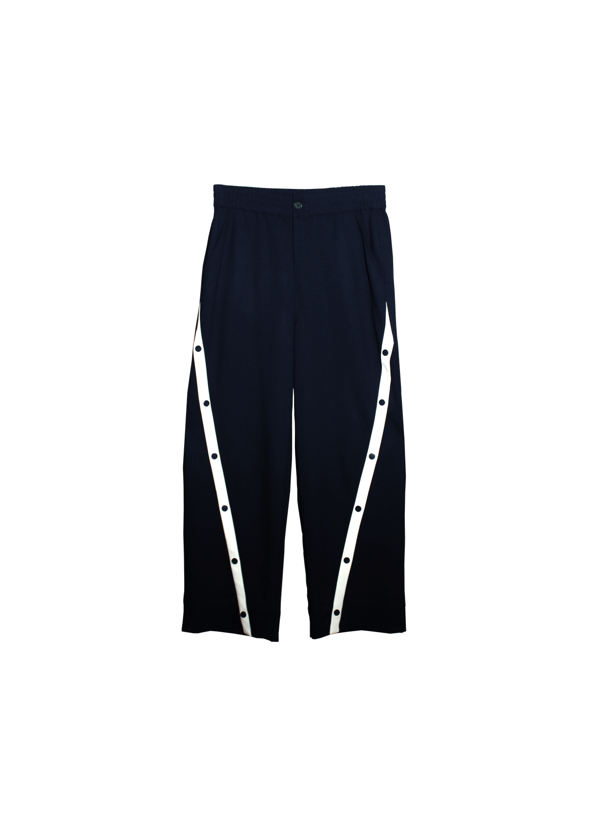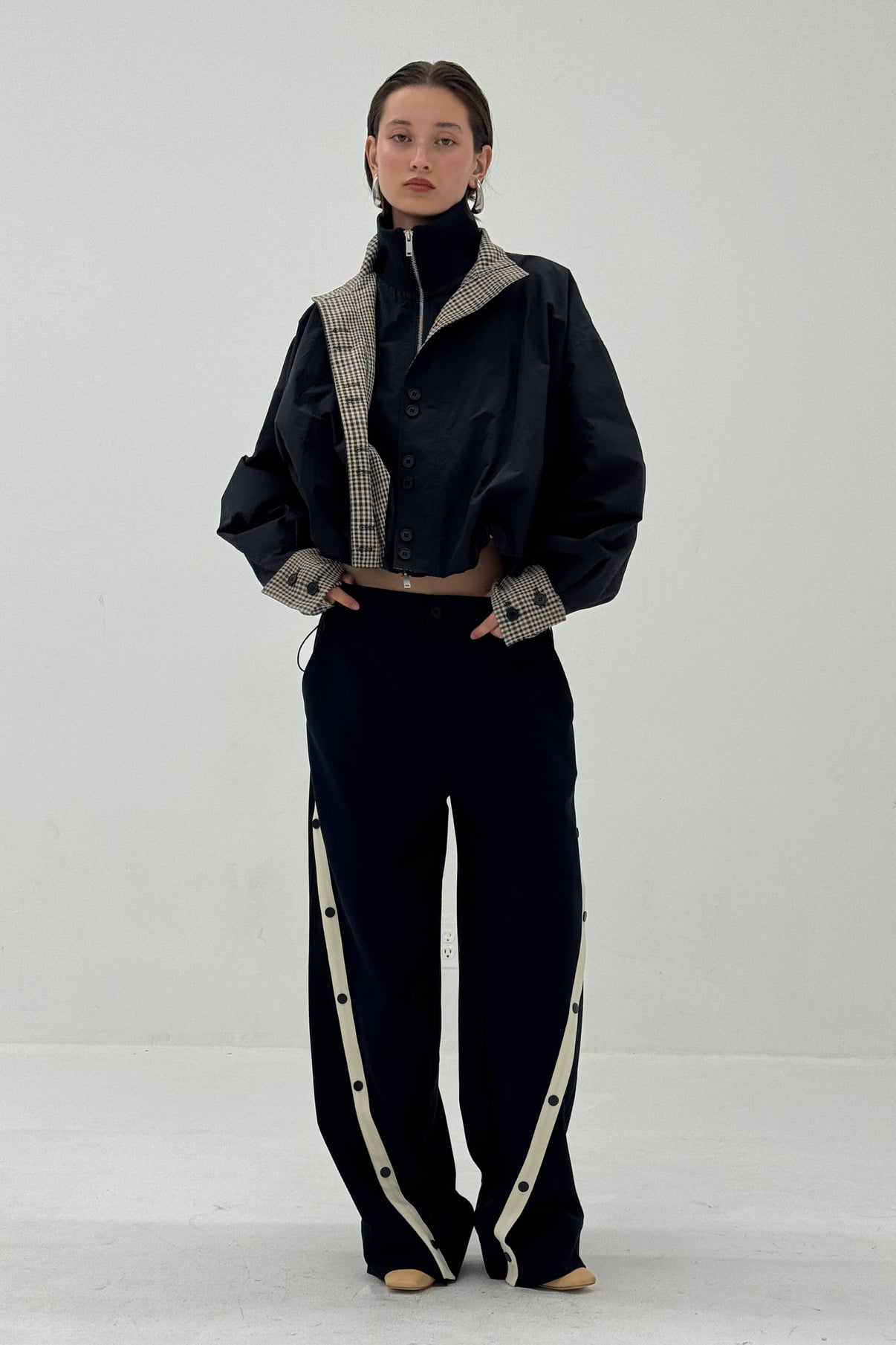 The Diagonal Placket Pants in Dark Navy are made from medium-weight faux tweed fabric with light stretch, wrinkle resistance, and durability. Fitted for a sleek silhouette with a unique diagonal placket detail and functional buttons on each leg. Polished, comfortable, and made to wear all day.