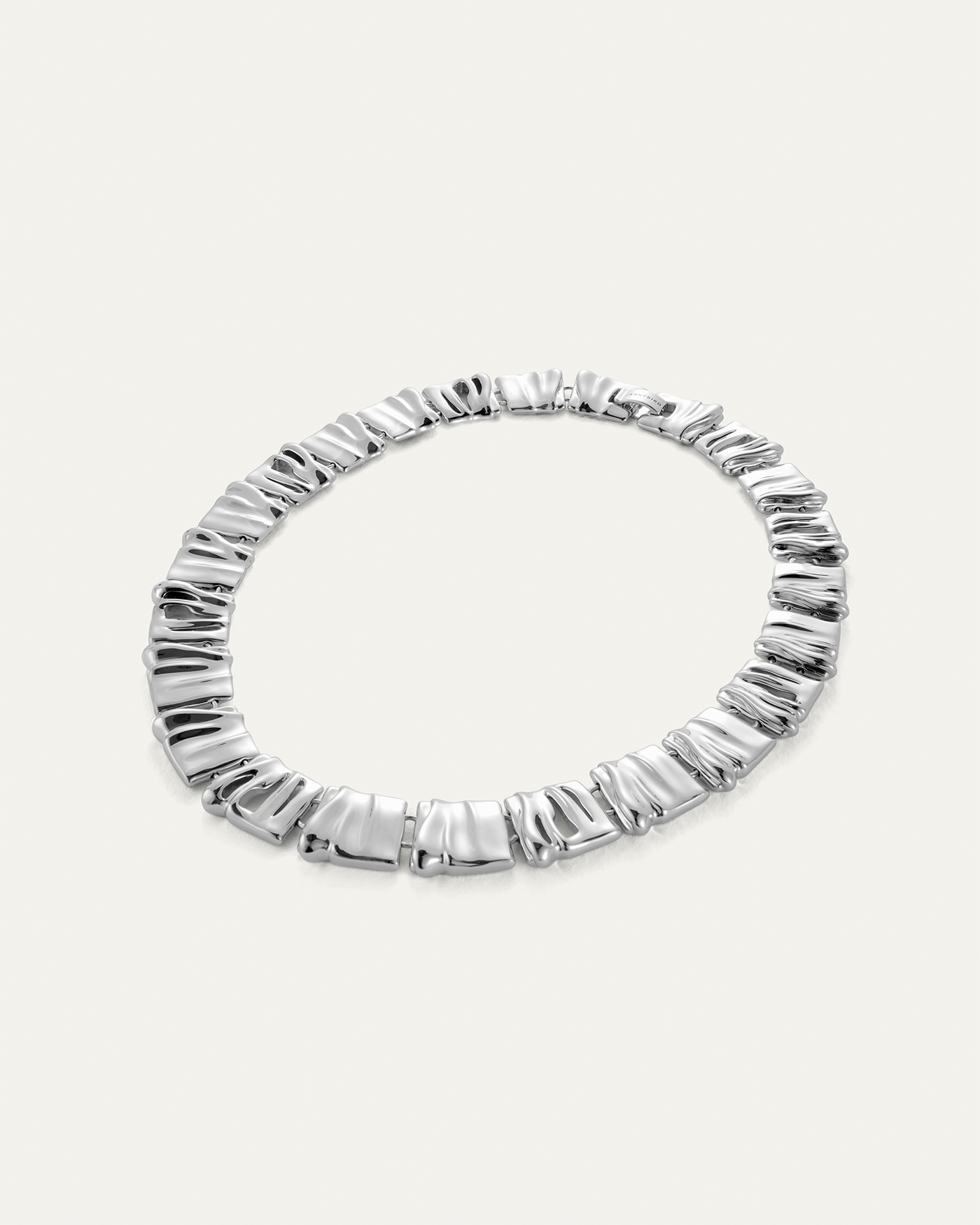 Organic square tiles mirror sand dunes shaped by natural winds. Each square is linked together forming a dynamic silver necklace full of texture