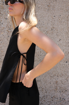 The Siemma Top in linen features side splits with spaghetti tie straps and a round high neck.