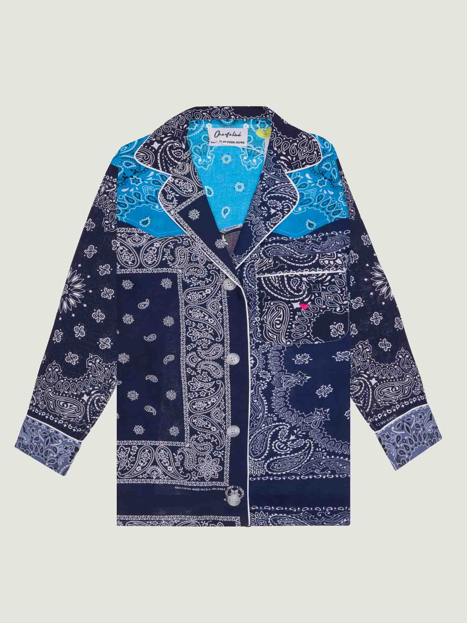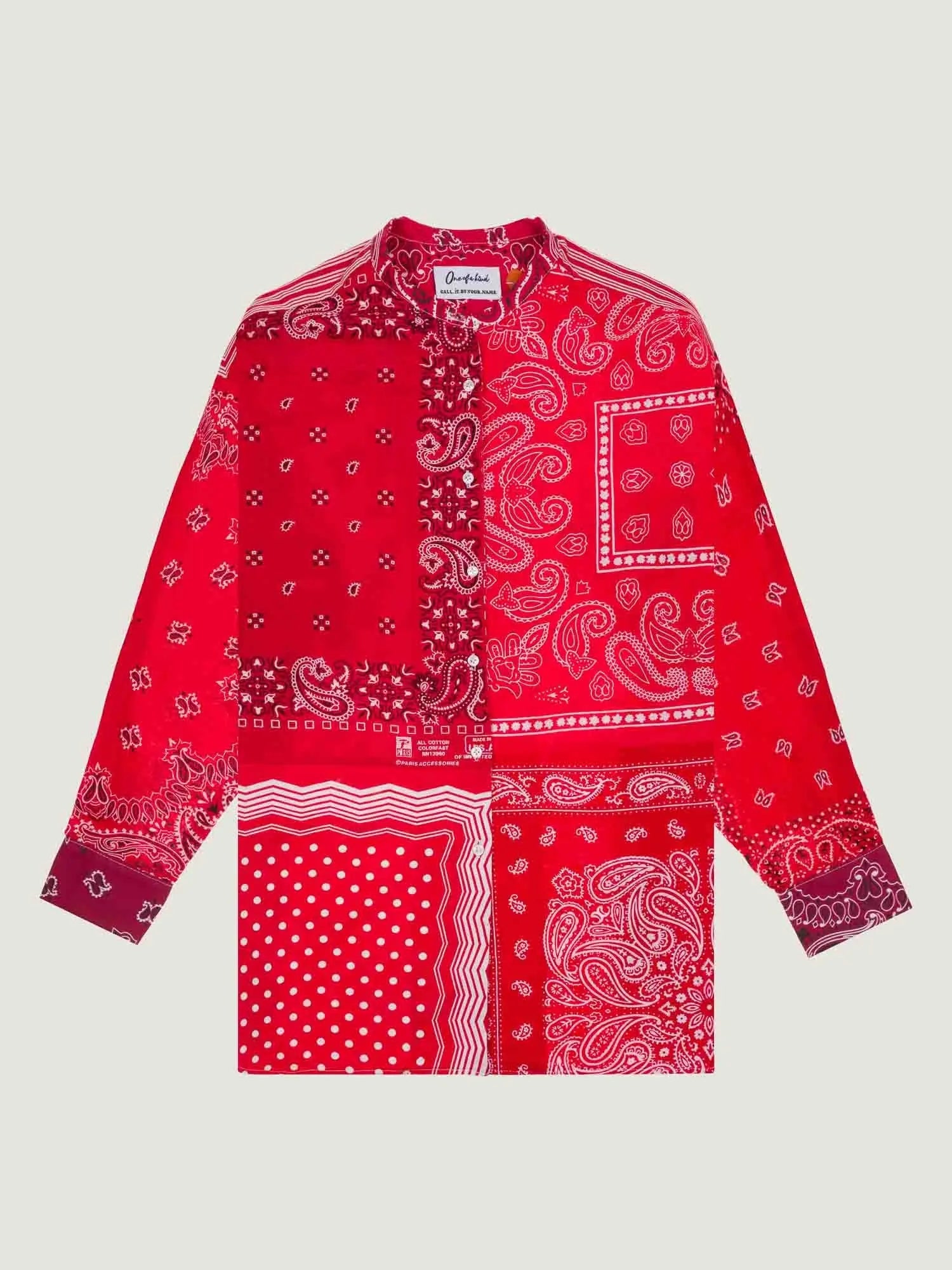 Button front closure. Mao collar. Lightweight fabric that won’t stretch. This model has an oversized fit and a large waist. Composition: 100% cotton. Bandanas upcycled or made in the USA. Shirt made in our Paris workshops. Care: This unique piece is delicate and requires special care: hand wash. Iron inside out with a very soft iron.