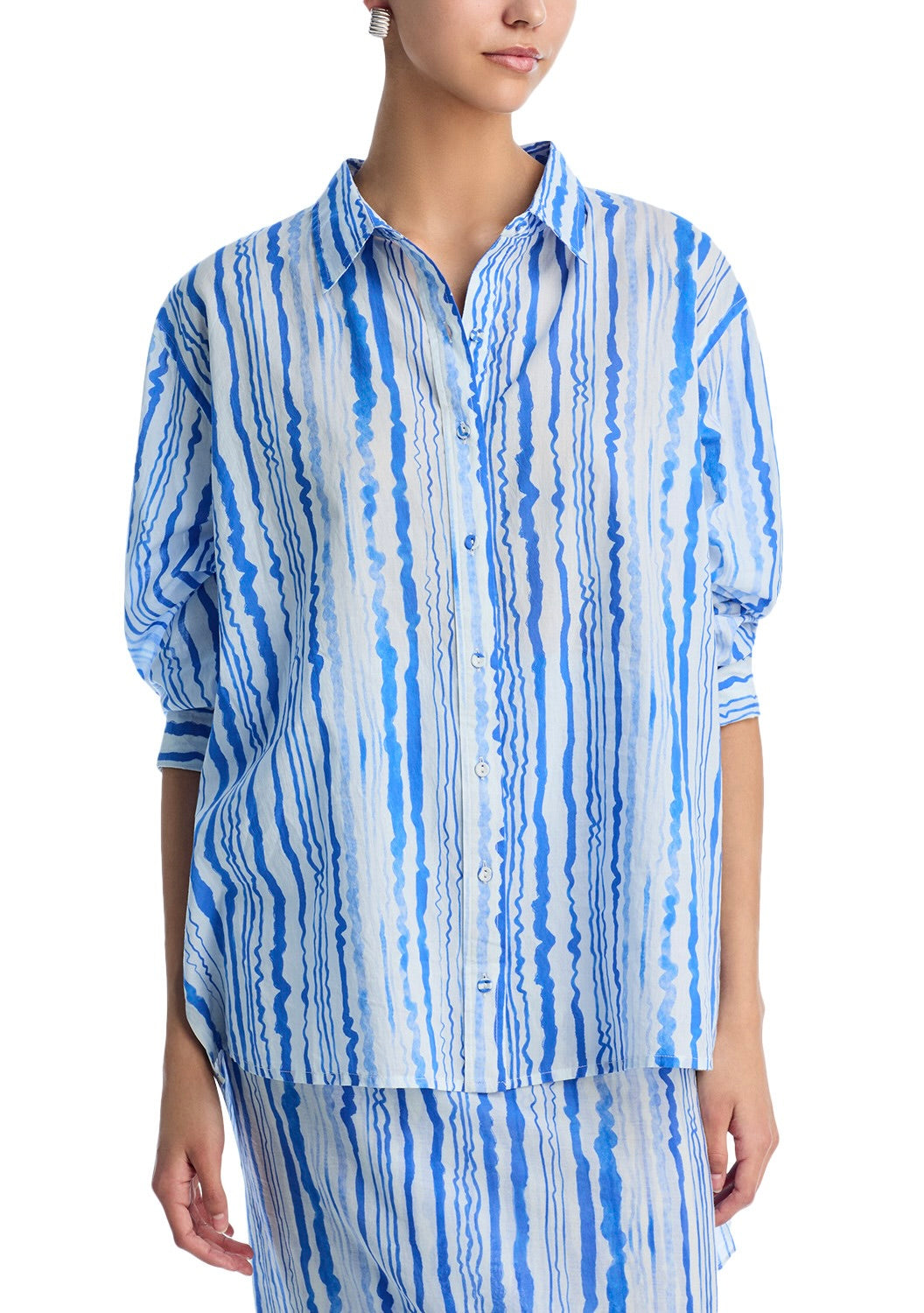 A longer fit at front and back body so it can be tucked in and worn with our signature Ruffle Power Pareo, but also supports a taller form. With functional center front placket and self-wrapped button detail that extends through the body, it can be worn closed as a traditional top or open as a layering item. Extra long sleeves with a tall cuff can be worn down based on your arms length, or folded back and cuffed up for a more petite length arm, or a casual feel.
