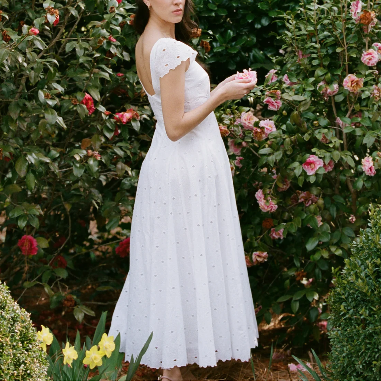 The Felicity makes a statement with her delicate eyelet embroidery and airy silhouette. The sleeve and dress hem showcase a floral scallop that provide it its luxurious finish. Made of 100% cotton, the Felicity creates an effortless summer look with flowy godets and a scoop back.