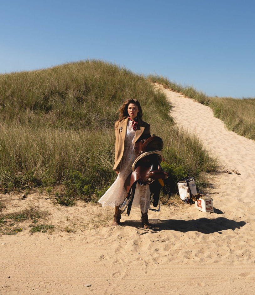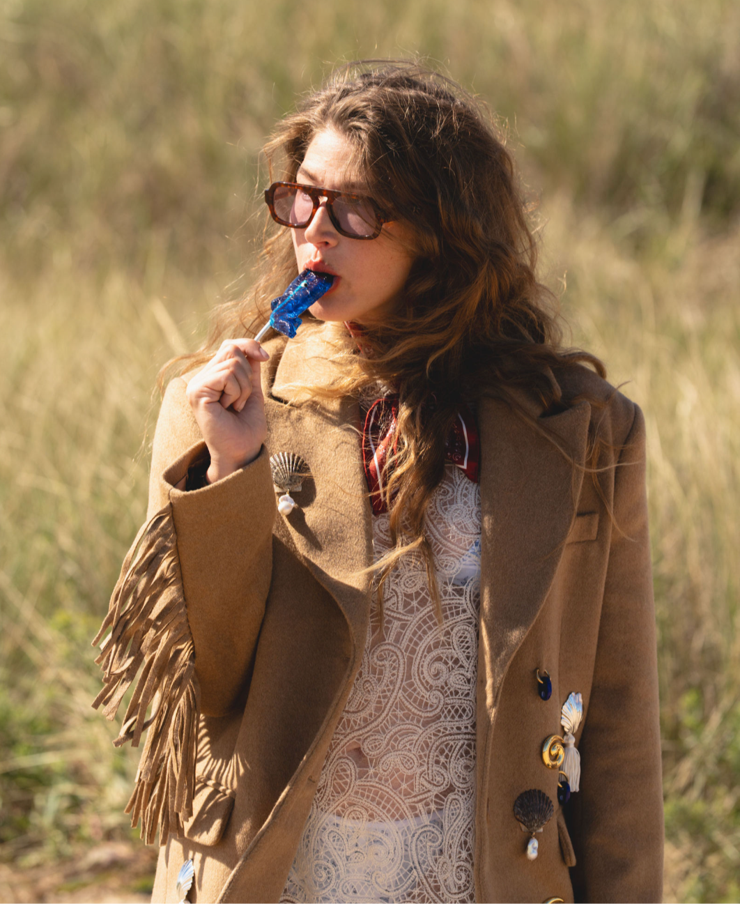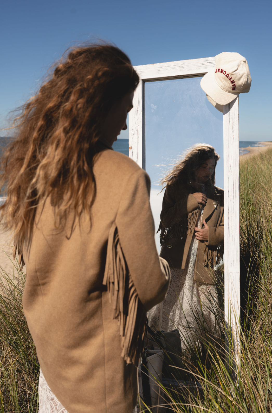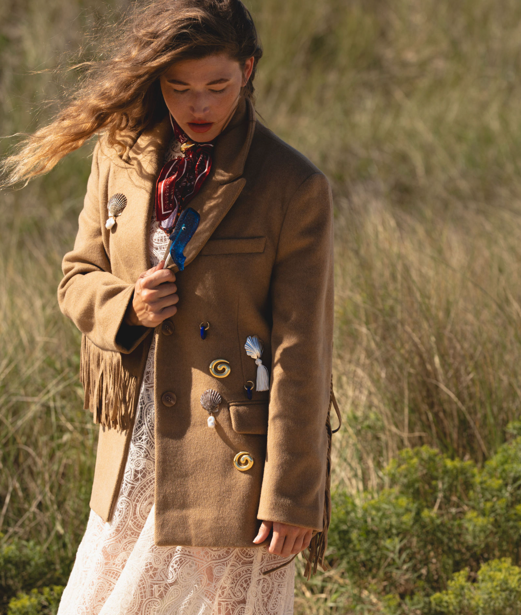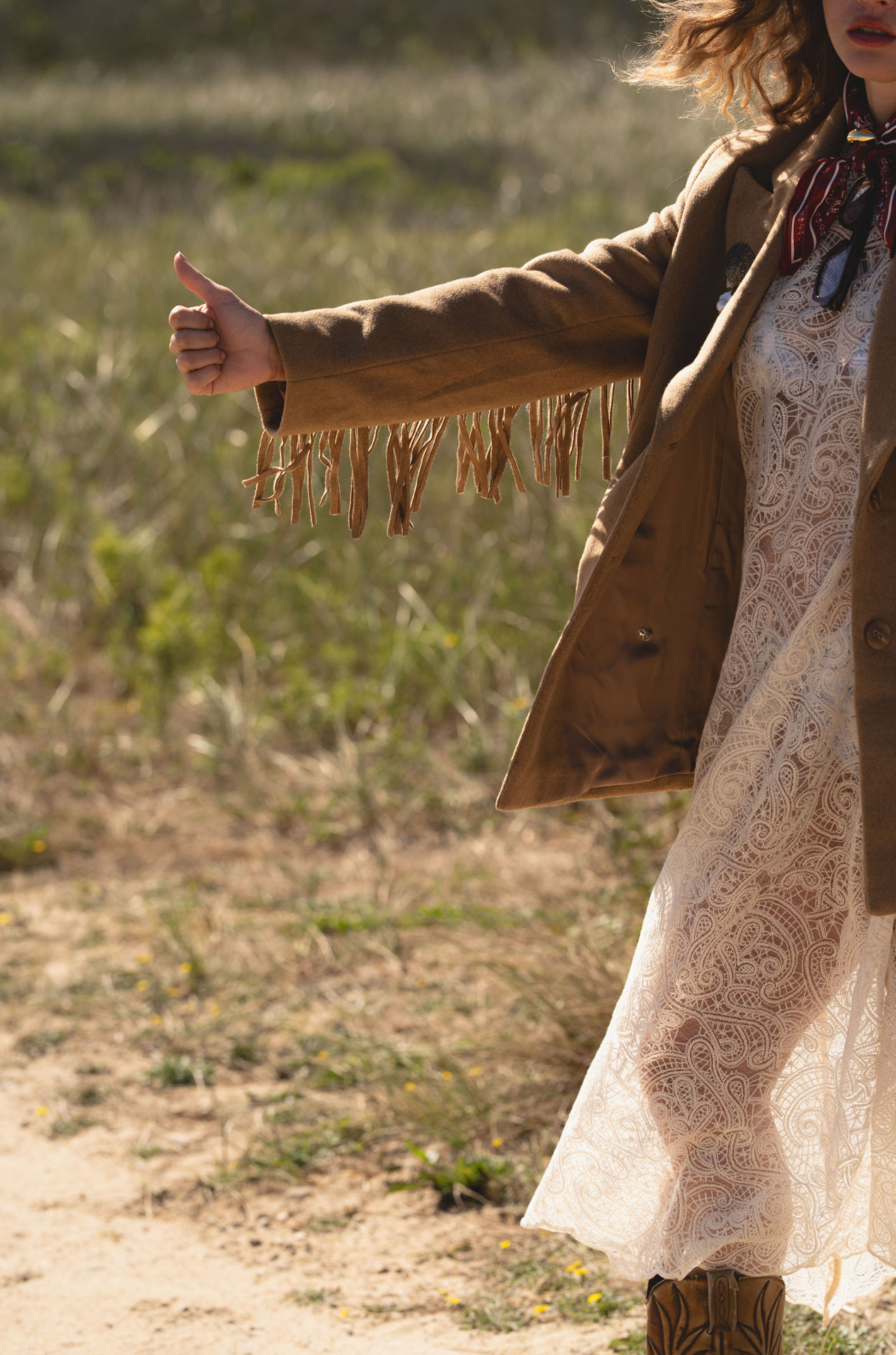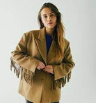 Western polish meets cool-girl tailoring. This wool-blend fringe blazer is cut in a relaxed fit with padded shoulders, flap pockets, and a sharp lapel — but it’s the long fringe sleeves that steal the show. A statement jacket that moves with you, whether you’re layering it over denim or throwing it on with a dress for instant edge.