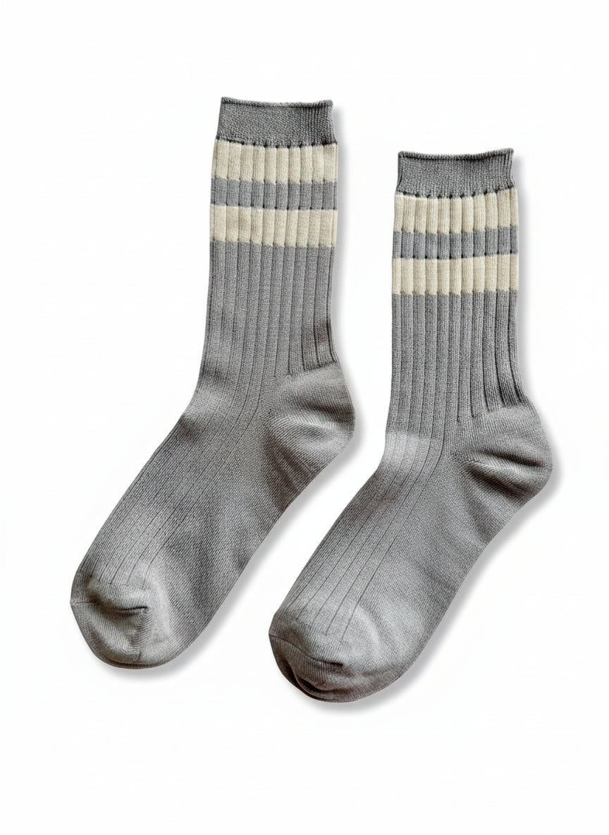 Socks should not be boring. Meet our go-to For all adventures. Her Varsity Socks are classically ribbed, perfect height, cotton blend durable, chic everyday essential socks. Add an understated sporty touch to any look with this bold stripe contrast version of Her Socks. She loves to be worn with a mini skirt, plaids, and oversized cable knit sweaters. Add embroidery for an extra-special touch.