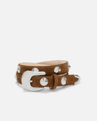 Soft suede, versatile belt made memorable by jewelry-like hardware—domed studs and a puffed horseshoe shape buckle silver tones.