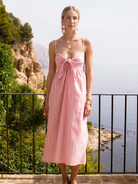 For dreamy days on the coast, The Francesco knot dress is made in a soft pink with red stripes and a subtle Lurex.